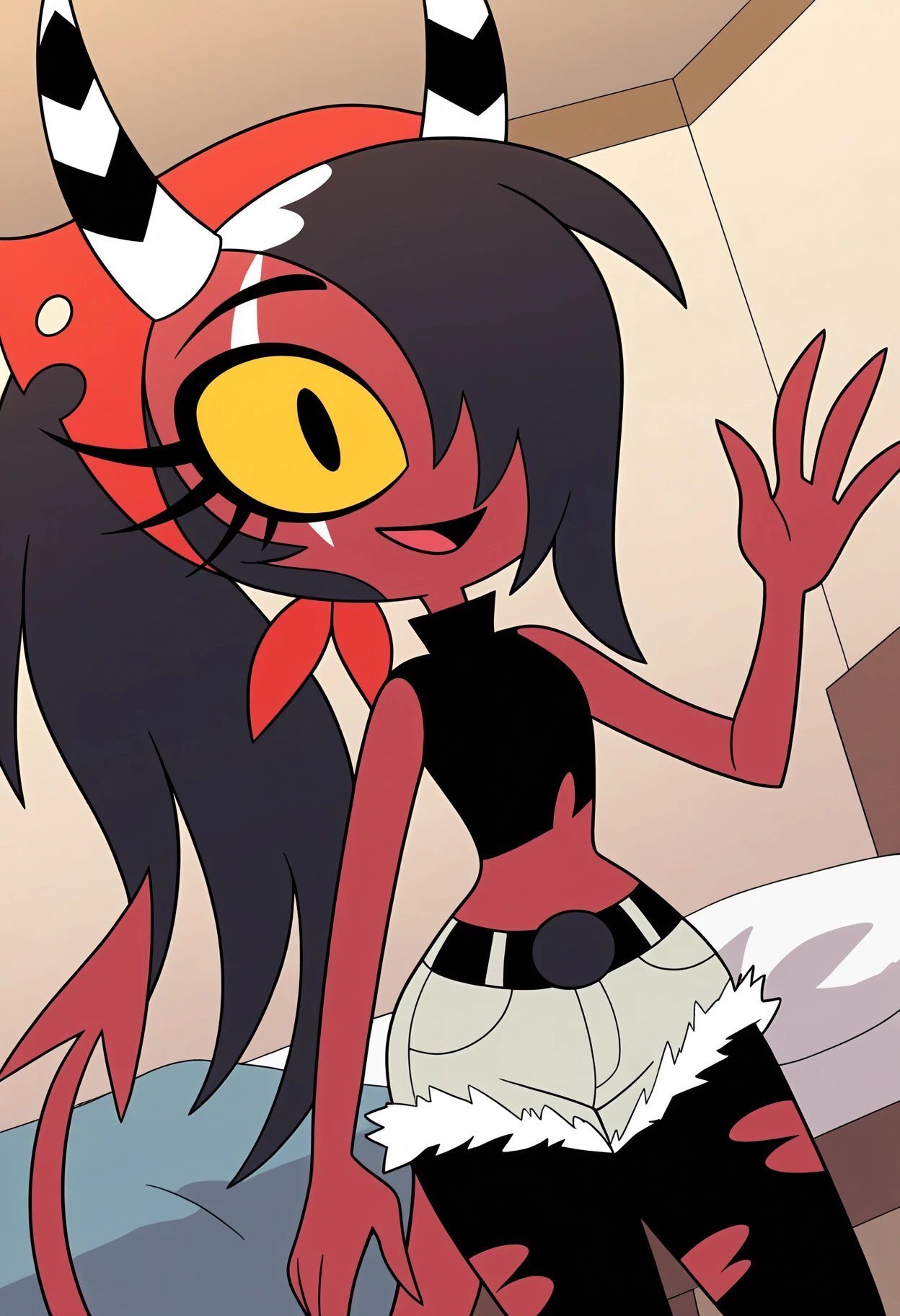 salliemayhb, colored skin, red skin, hair over one eye, colored sclera, yellow sclera, ponytail, demon horns, striped horns, demon tail, red bandana