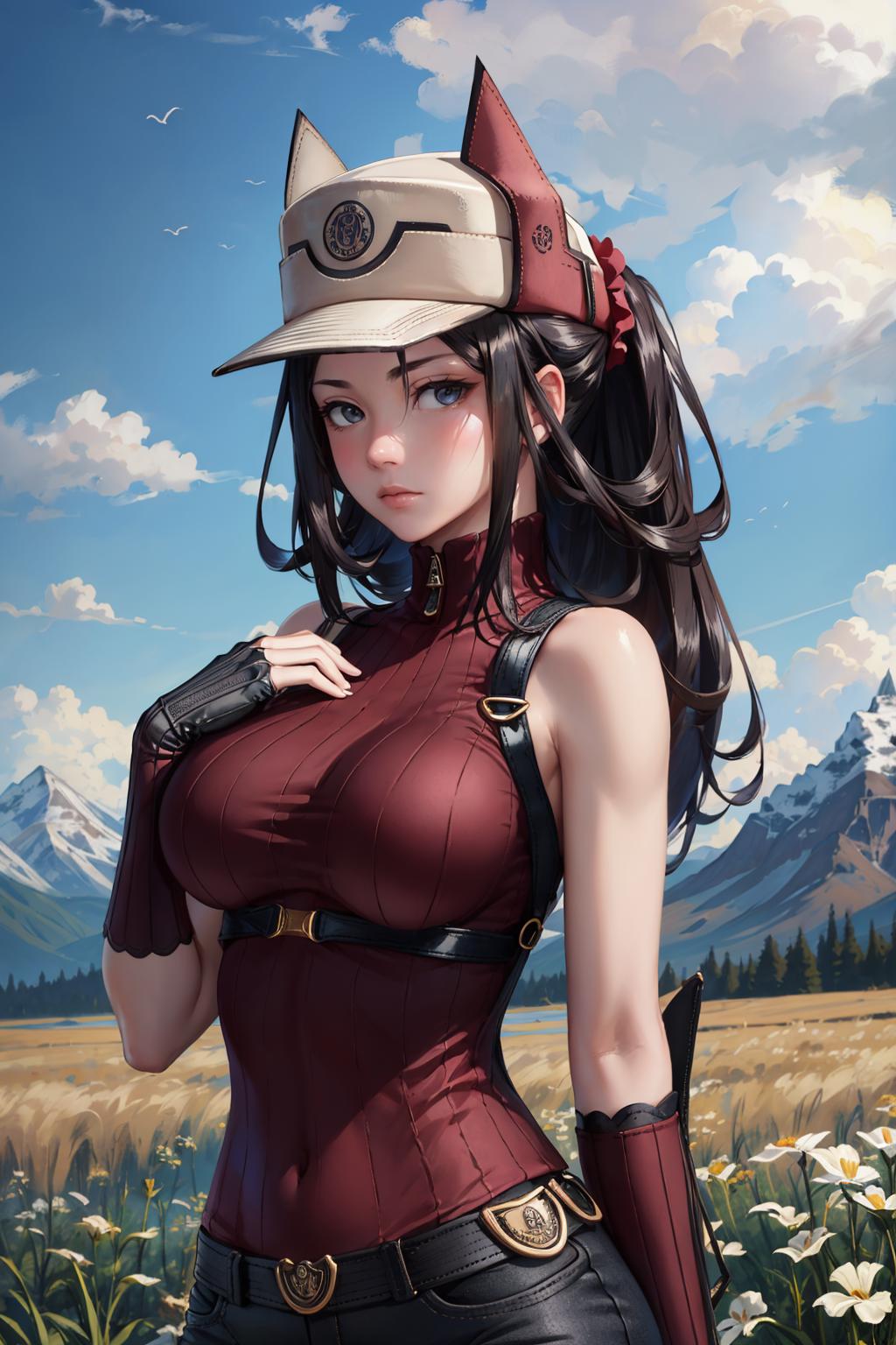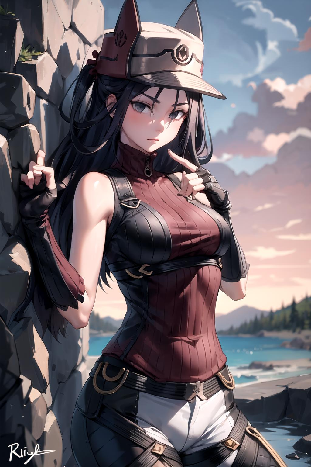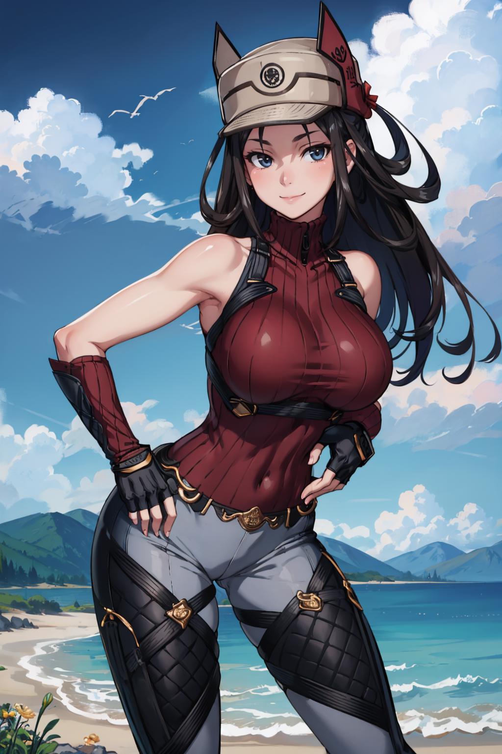 Add "hat, ribbed sweater, sleeveless, pants, fingerless gloves" for her sweater.