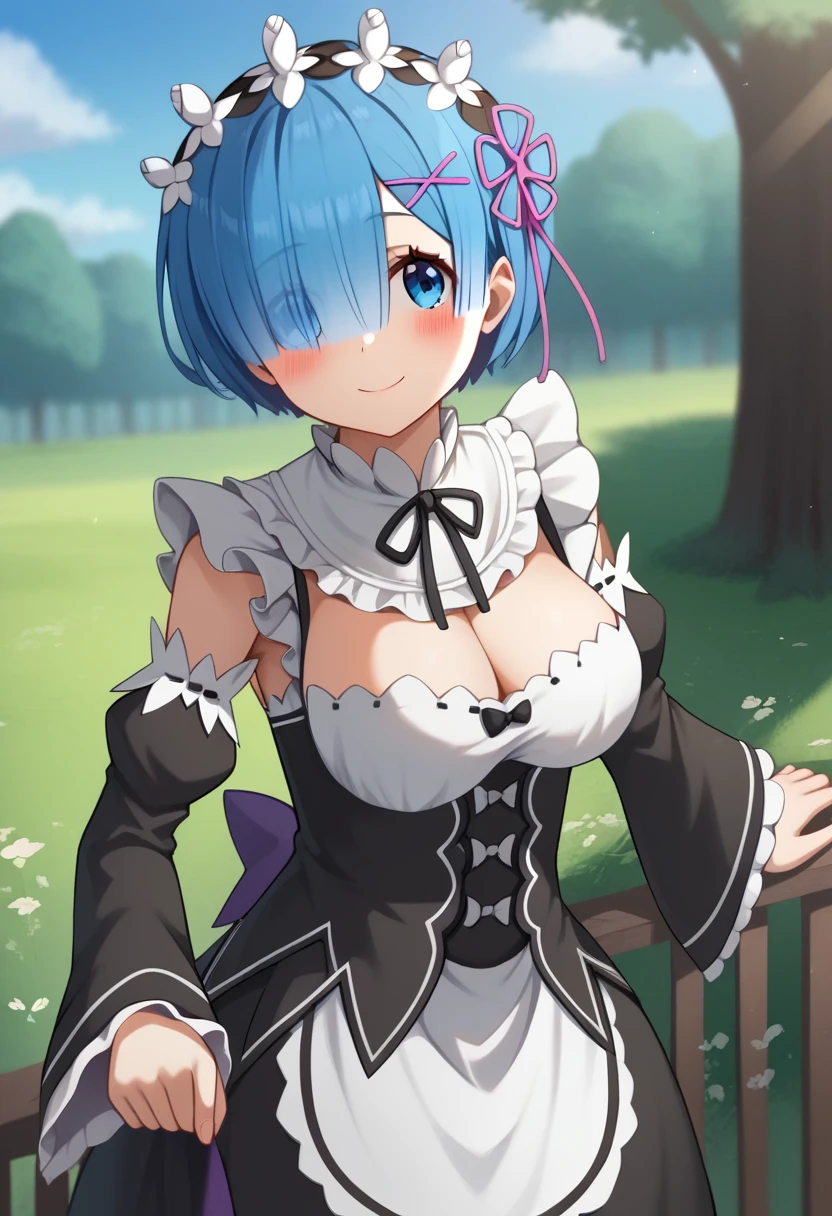 触发词:1girl,solo,rem_\(re:zero\),blue_eyes,hair_over_one_eye,short_hair,blue_hair,hair_ribbon,roswaal_mansion_maid_uniform,