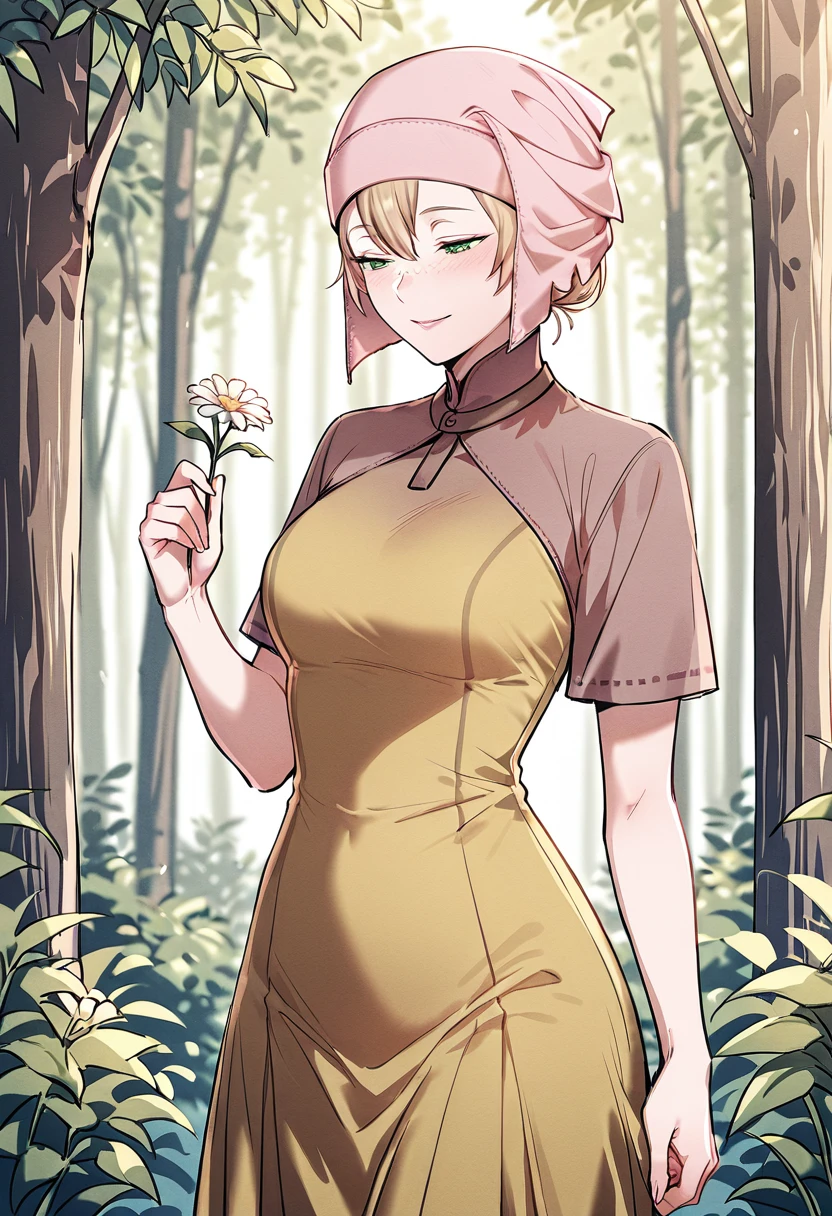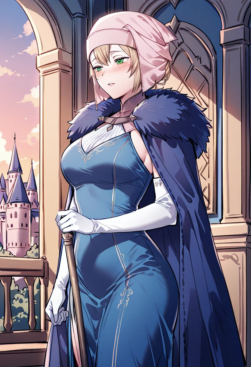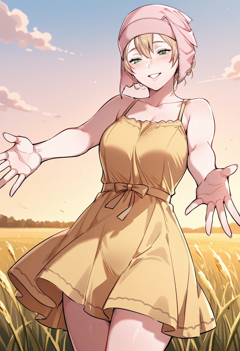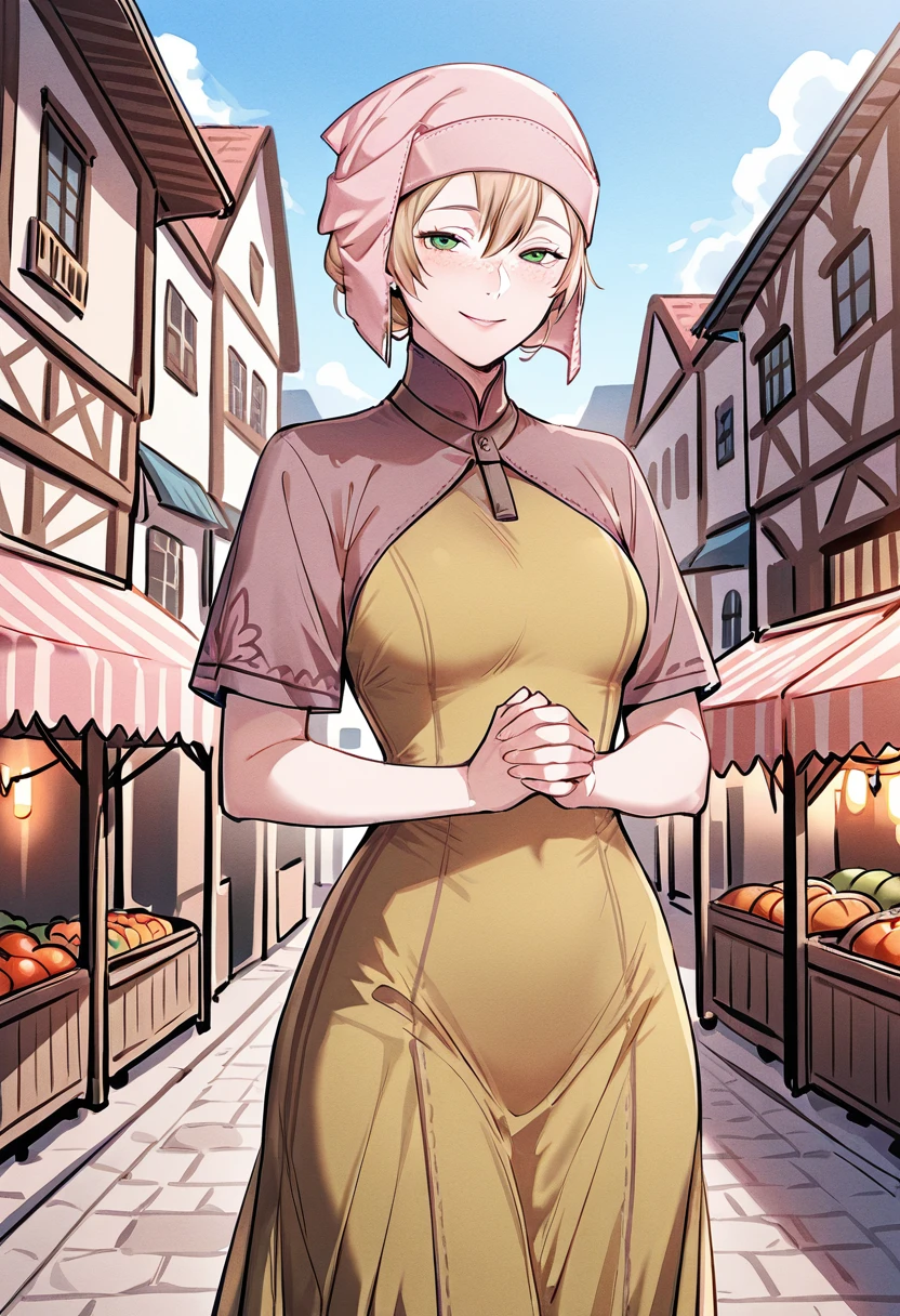 VMaidenFEA, mature female, blonde hair, short hair, freckles, green eyes, pink headscarf,