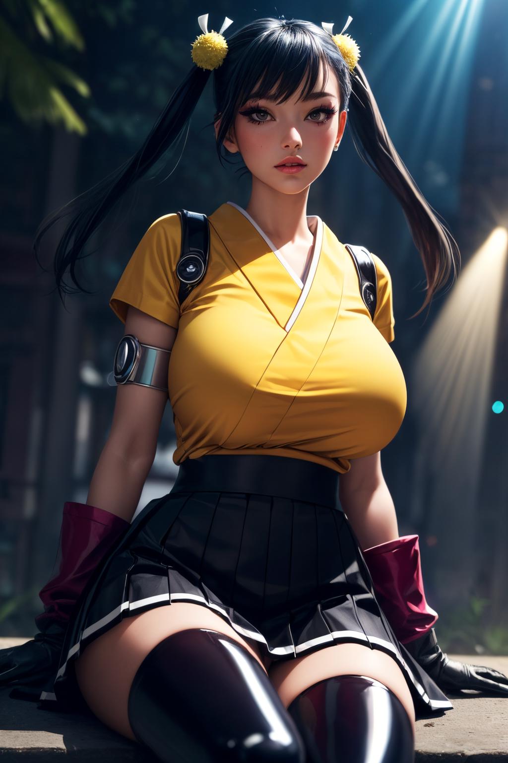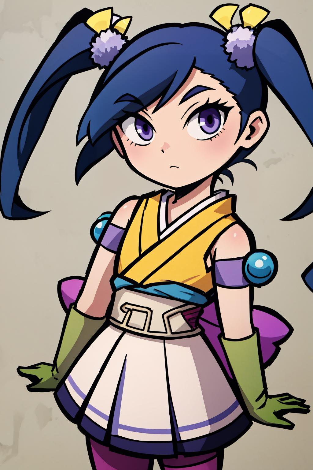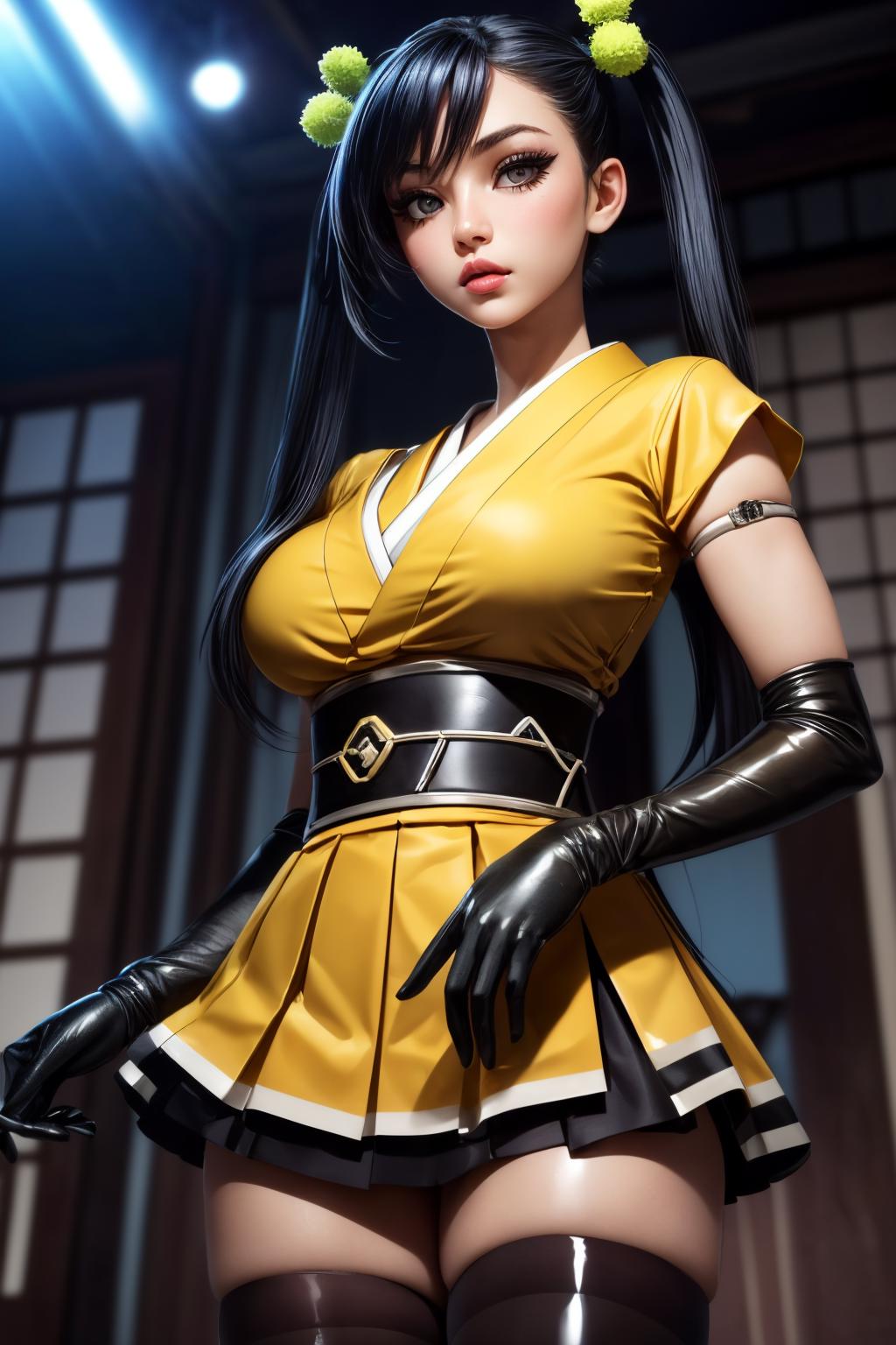japanese clothes, yellow shirt, armband, skirt, purple thighhighs, gloves