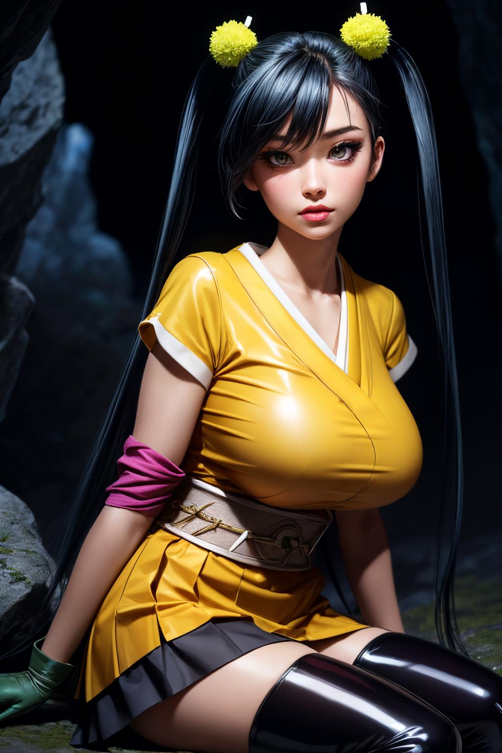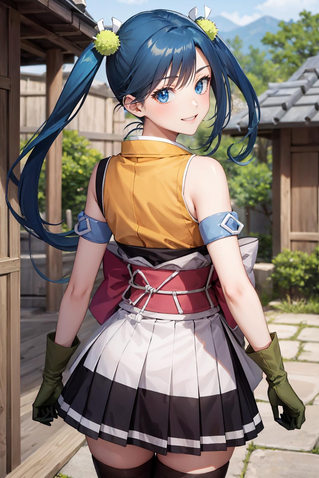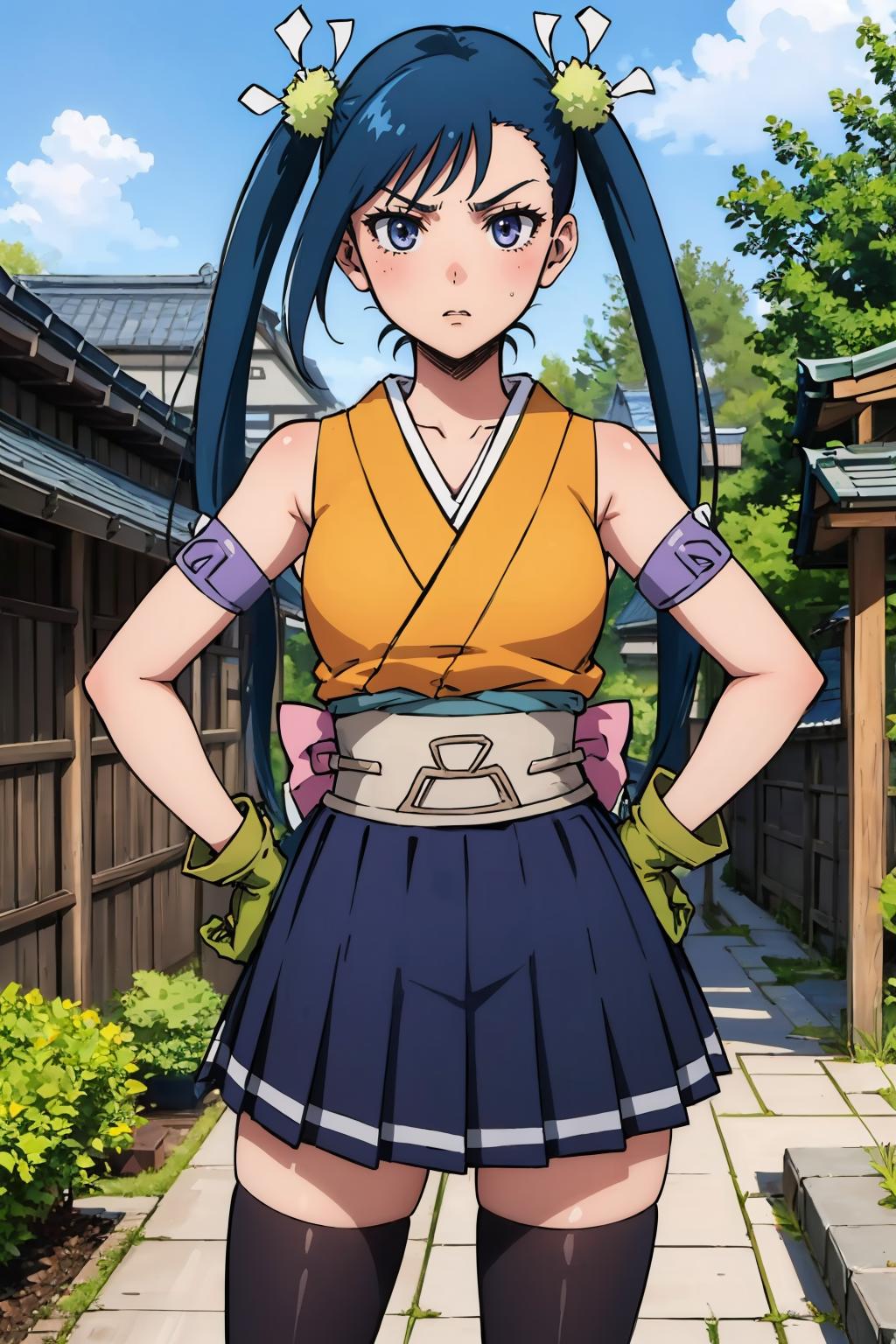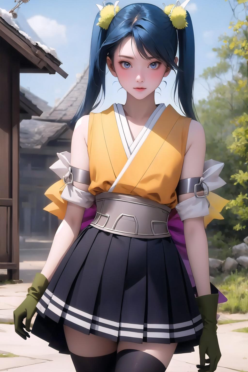 "japanese clothes, yellow shirt, armband, skirt, purple thighhighs, gloves"