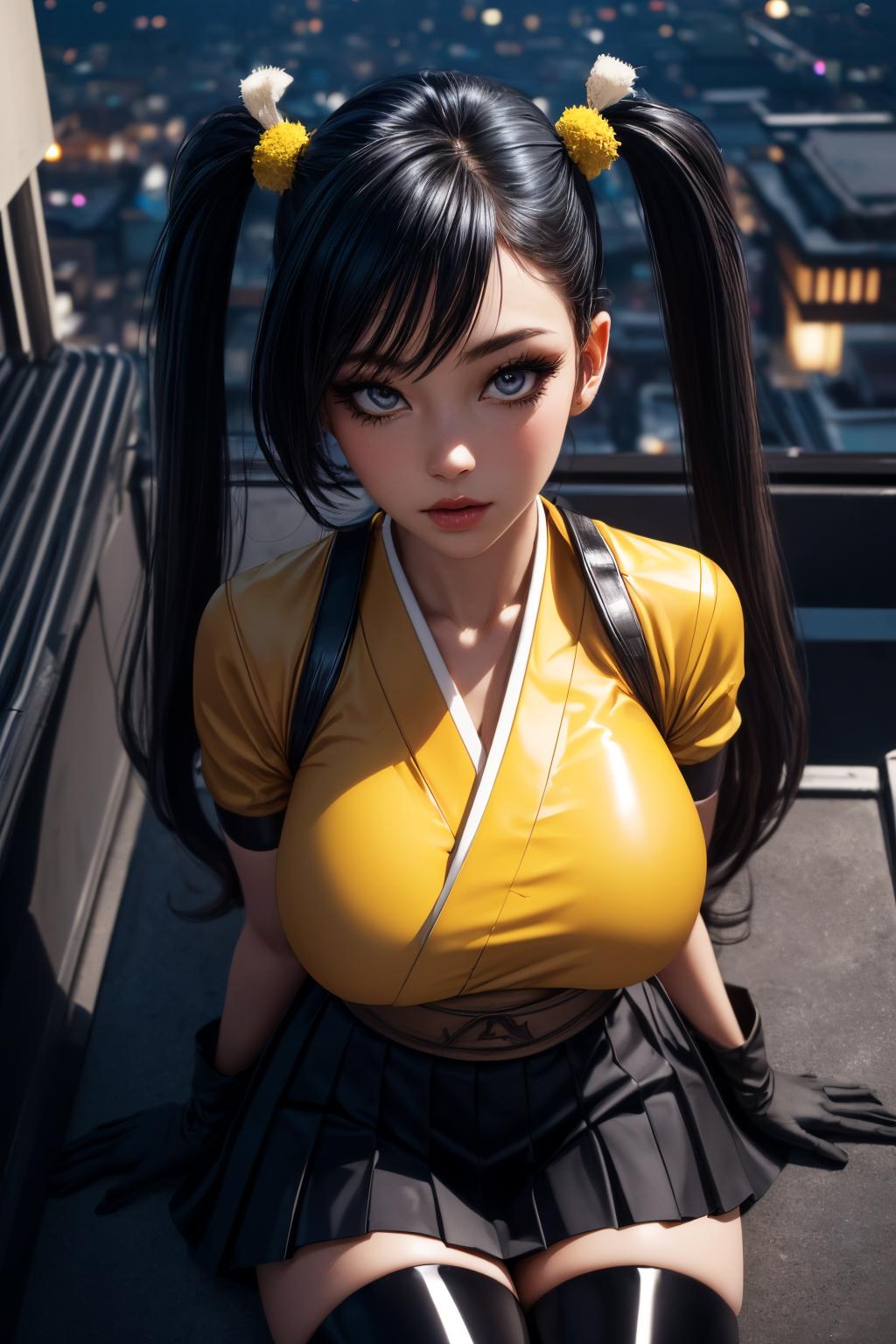 Add "twintails, long hair, hair ornament" for her standard appearance.
