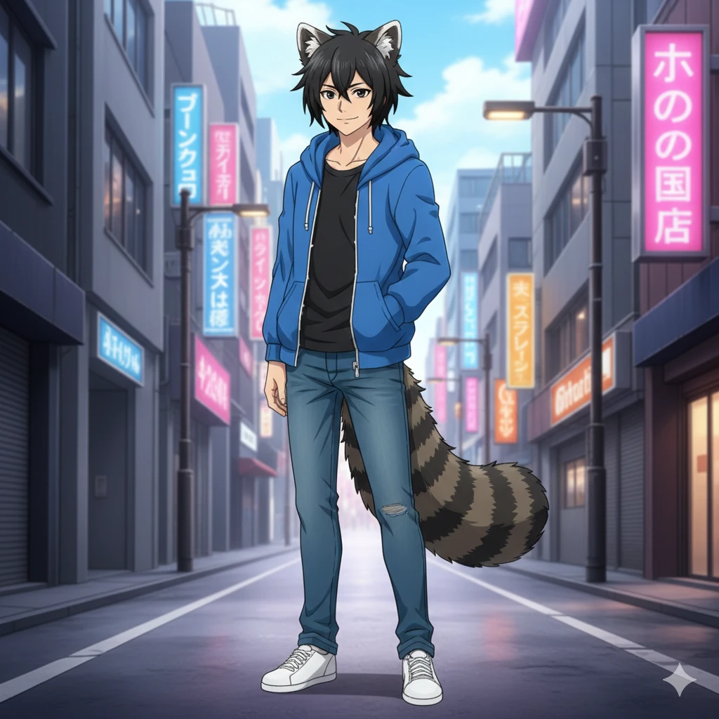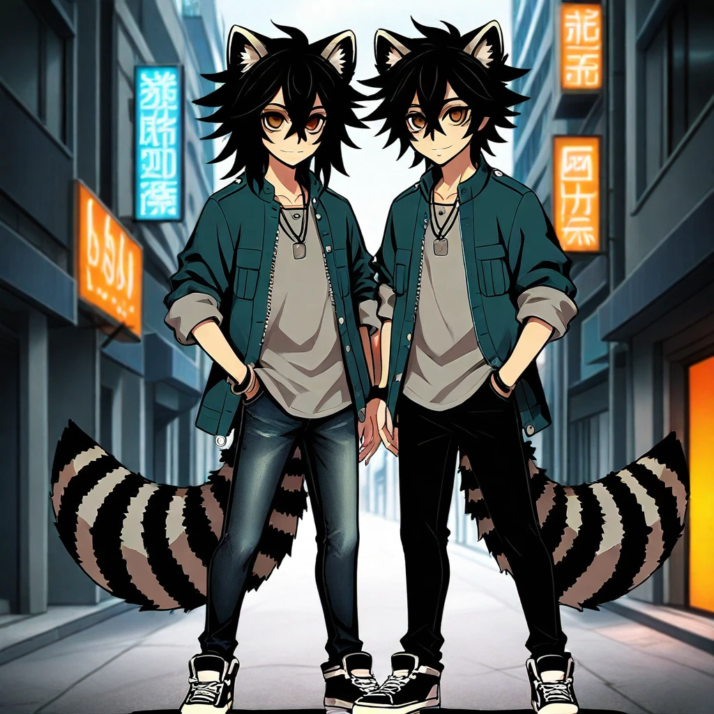1boy, ferrakun, , solo, raccoon boy, kemonomimi, very messy black hair, spiky hair, large raccoon ears, thick striped raccoon tail, bushy tail, glowing orange eyes, mischievous grin, teal open jacket, rolled up sleeves, grey t-shirt, dog tag necklace, black wristbands, black pants, silver wallet chain on pants, orange sparkles, black pants, chunky sneakers, crossbody bag,