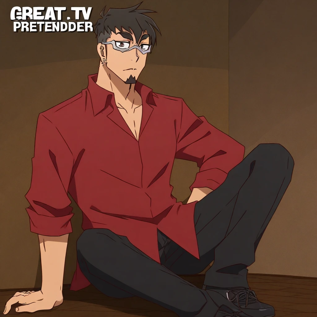 Prompt: Jay Chiang, black hair, short hair, dark brown eyes, thick eyebrows, sideburns, facial hair, goatee, earring, red collared shirt, grey necktie, black vest, sleeves rolled up, black pants