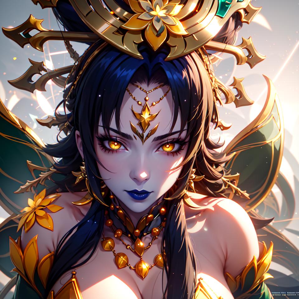 For green: black hair, very long hair, yellow eyes, green dress, blue lips,