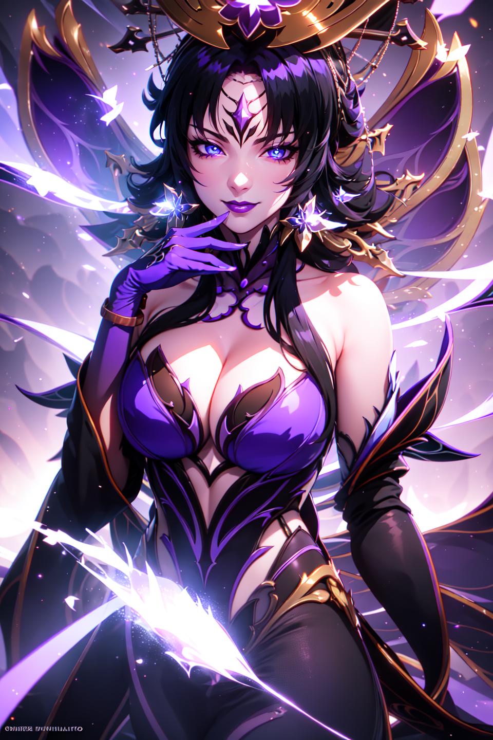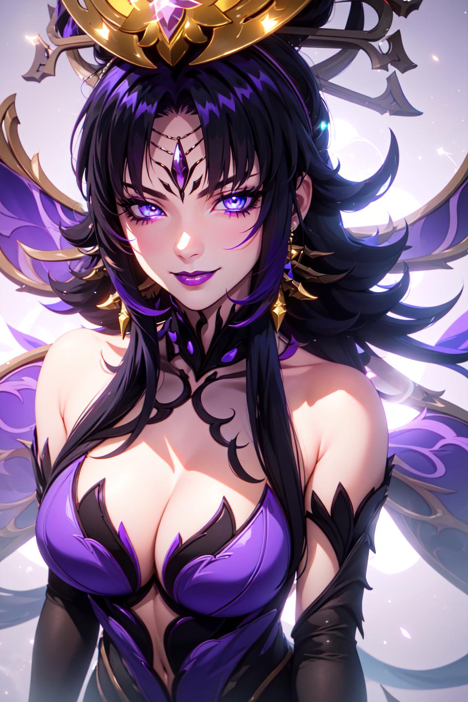 For purple: black hair, very long hair, blue eyes, purple dress,