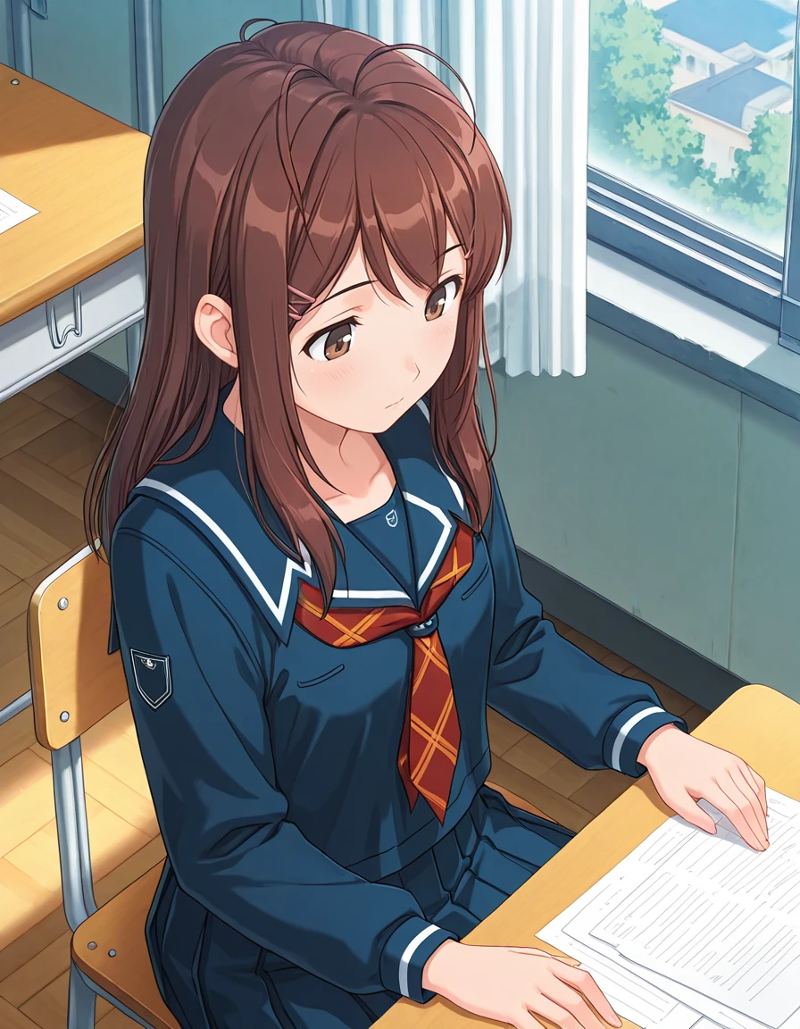 <lora:yuumi_hoshino-kimikiss_pure_rouge_s1-ixl-anime-soralz:1>, yuumi hoshino (kimikiss pure rouge), long hair, brown hair, antenna hair, hairclip, sidelocks, brown eyesOutfit - School Uniform (Winter)