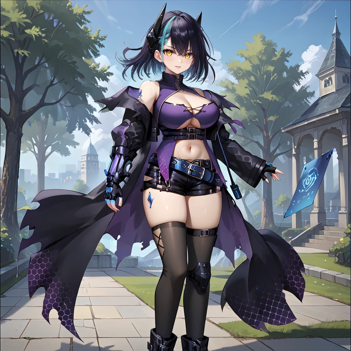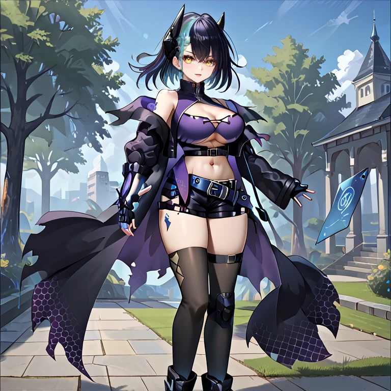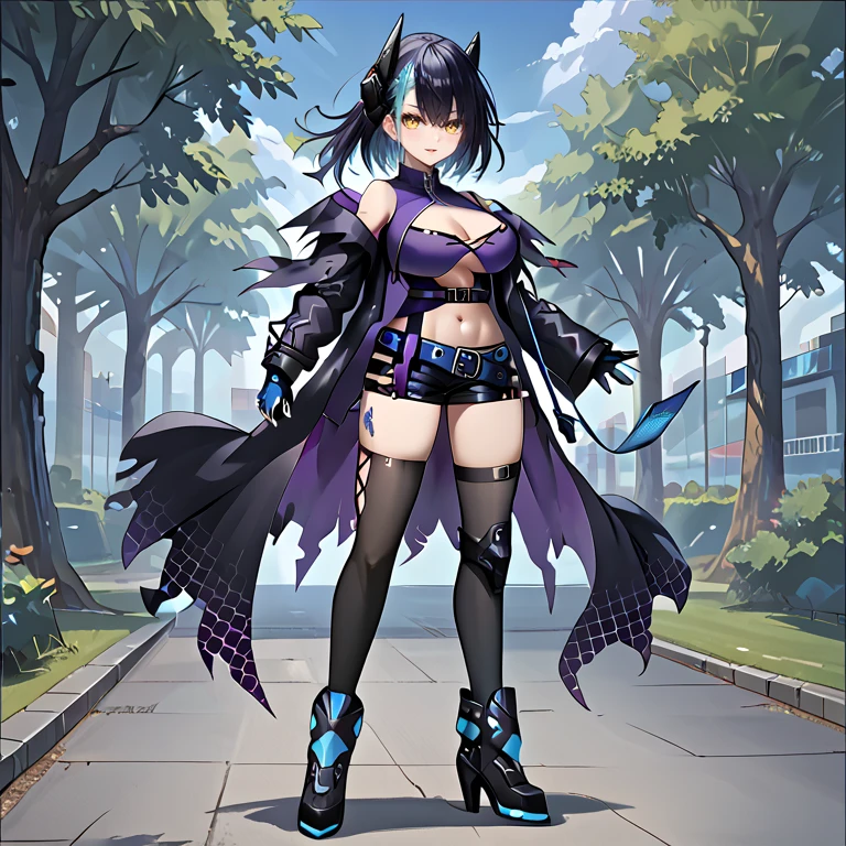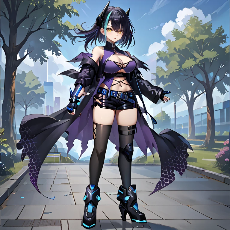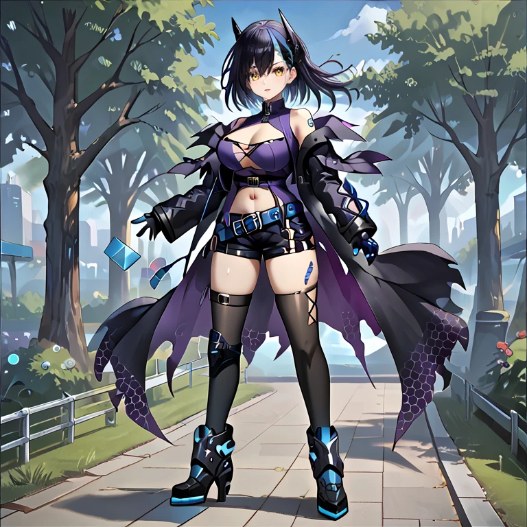 starry_hb, breasts, bangs, gloves, navel, cleavage, bare shoulders, full body, yellow eyes, black boots, open clothes, sleeveless, black gloves, midriff, belt, black thighhighs, streaked hair, coat, fur trim, short shorts, clothing cutout, underboob, black shorts, cleavage cutout, black coat, park, dynamic pose,