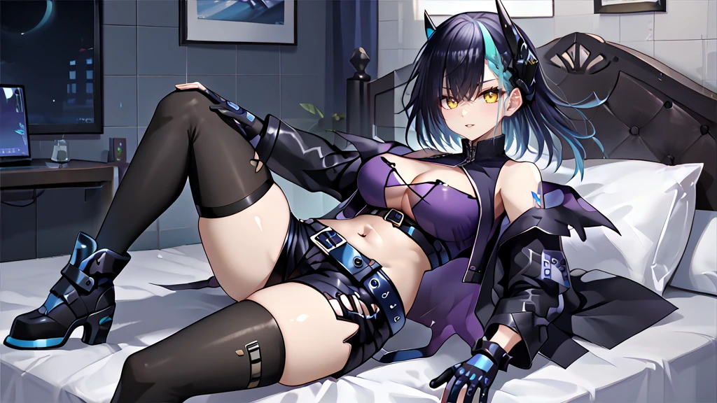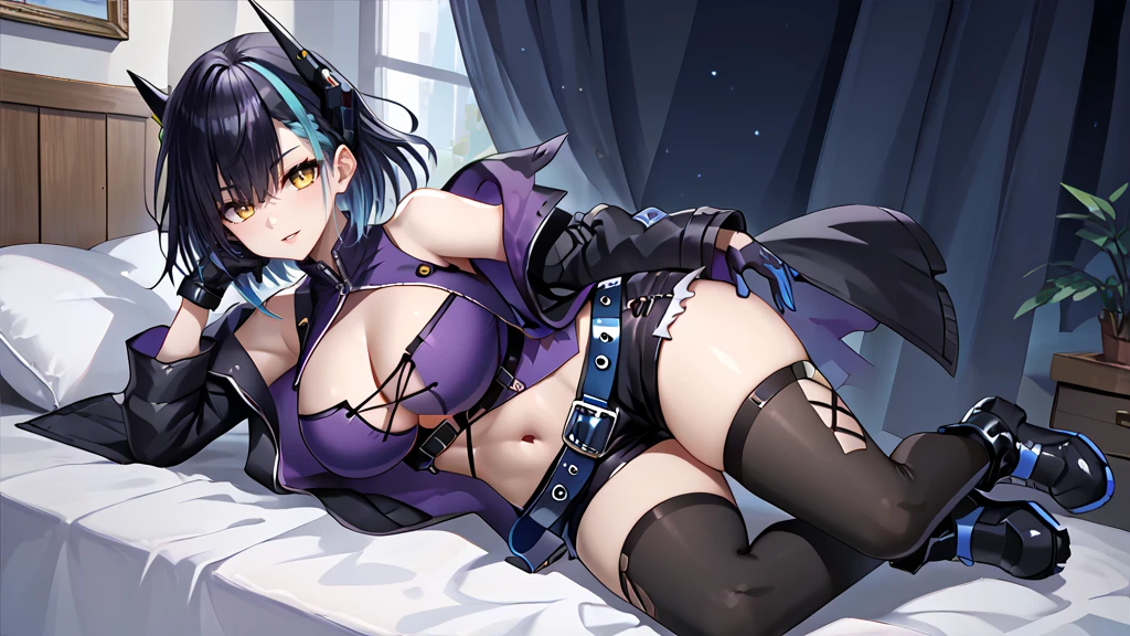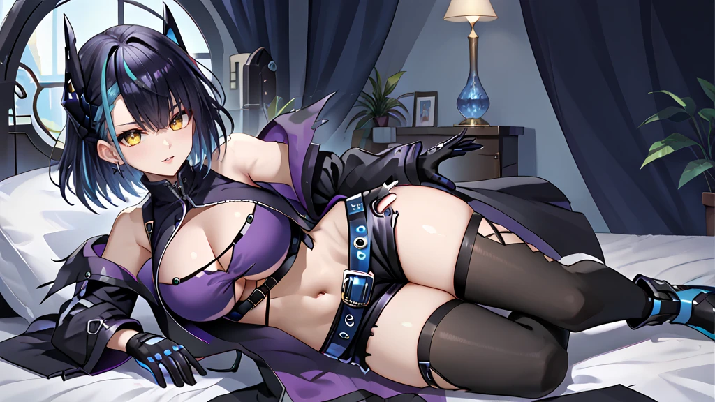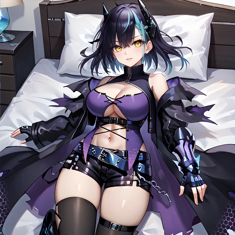 starry_hb, bangs, gloves, navel, cleavage, bare shoulders, yellow eyes, black boots, open clothes, sleeveless, black gloves, midriff, belt, black thighhighs, streaked hair, coat, fur trim, short shorts, clothing cutout, underboob, black shorts, cleavage cutout, black coat,