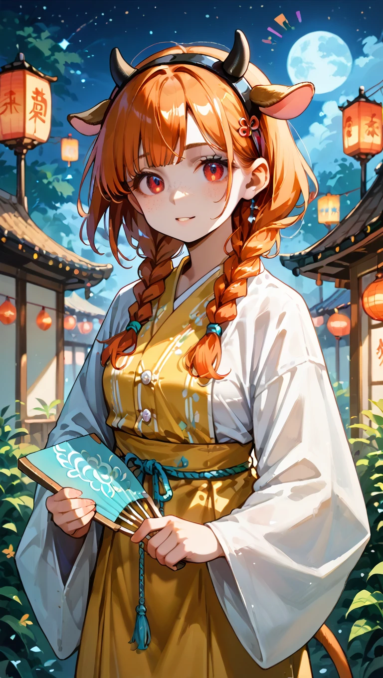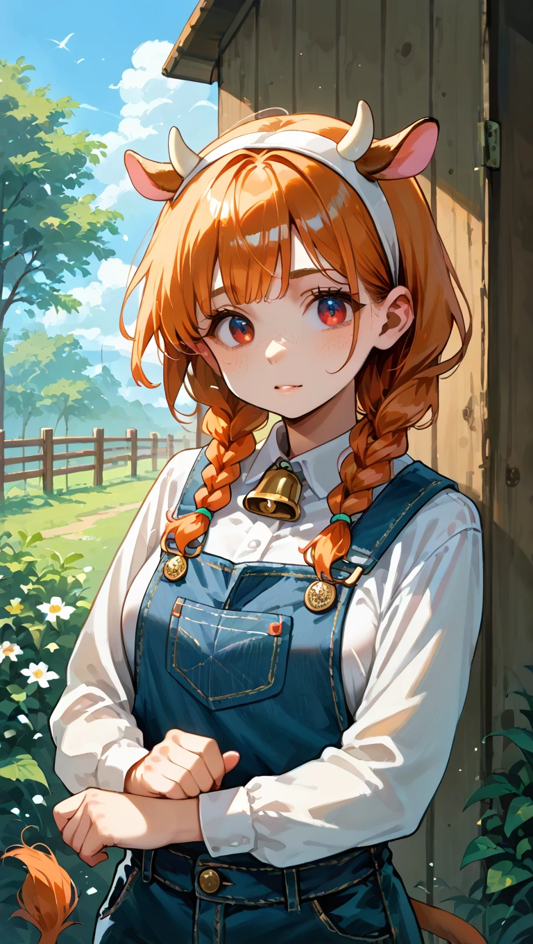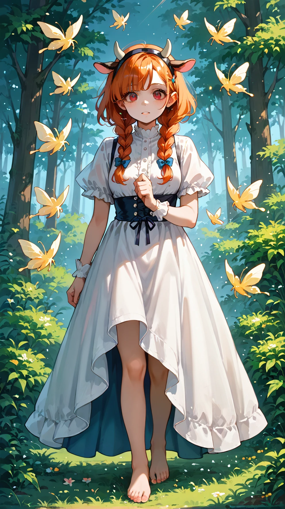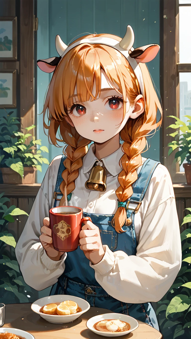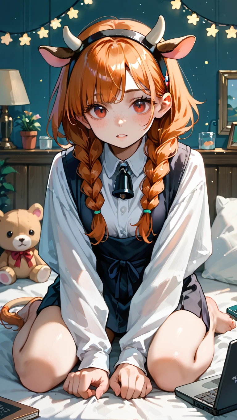 lucygramd, cow horns, red eyes, orange hair, twin braids,