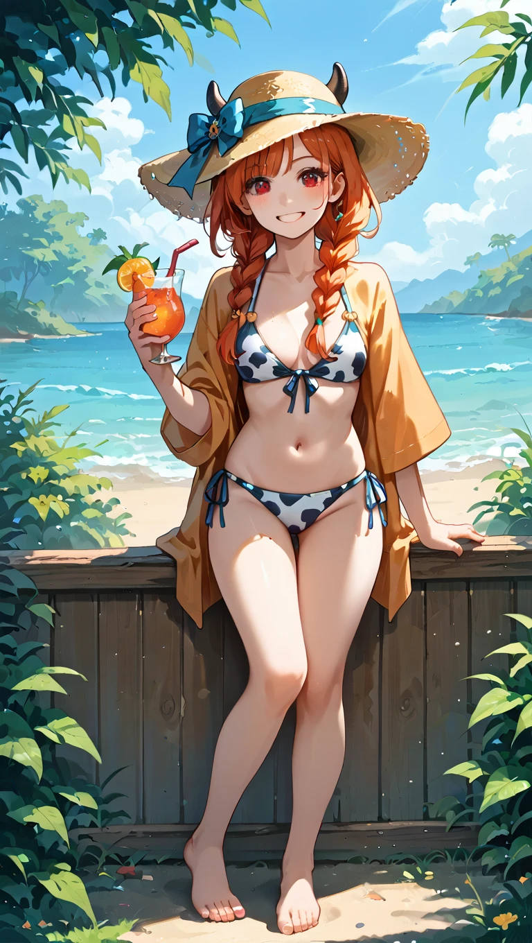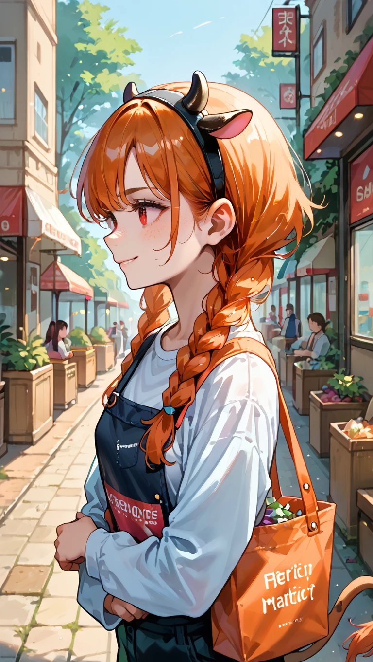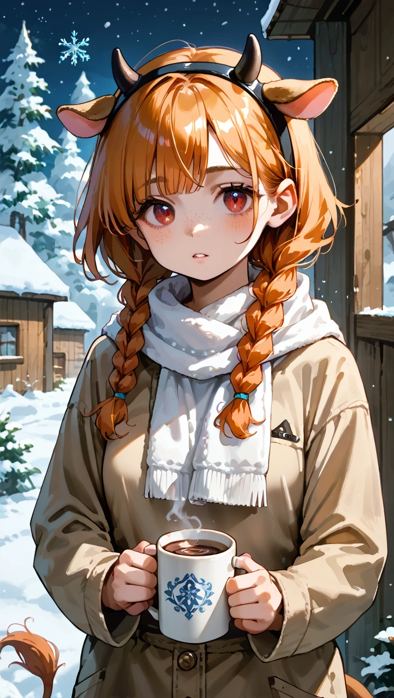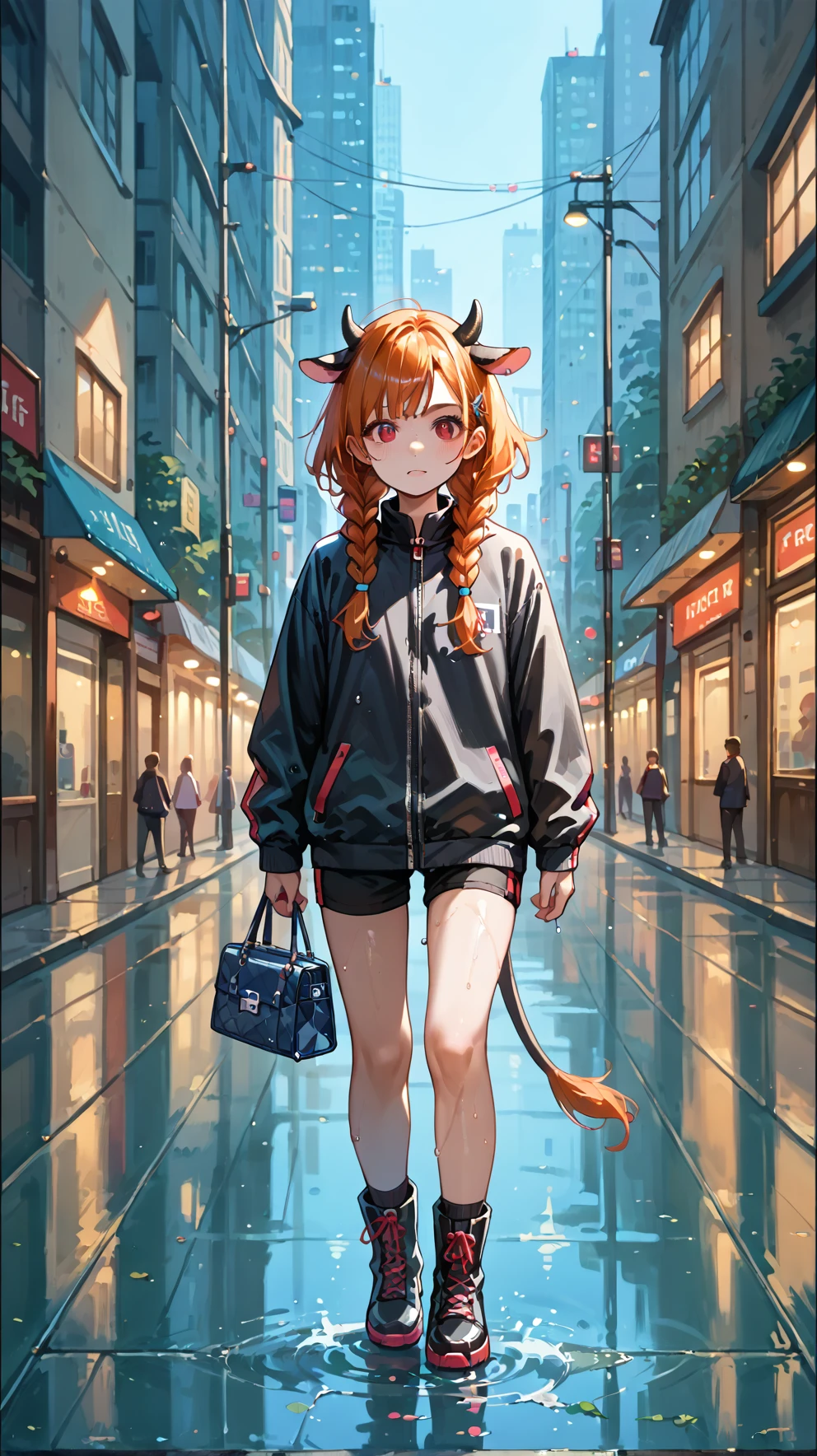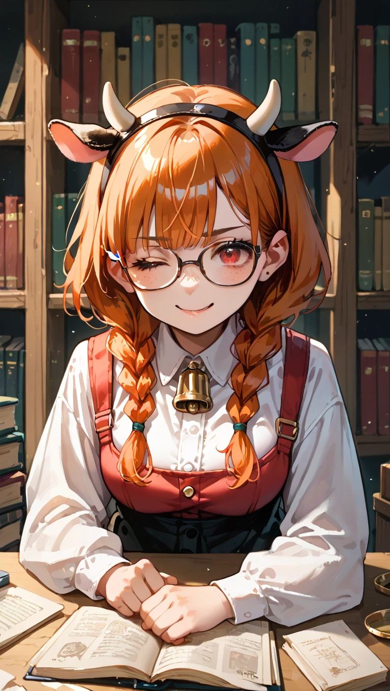 lucygramd, cow horns, red eyes, orange hair, twin braids,