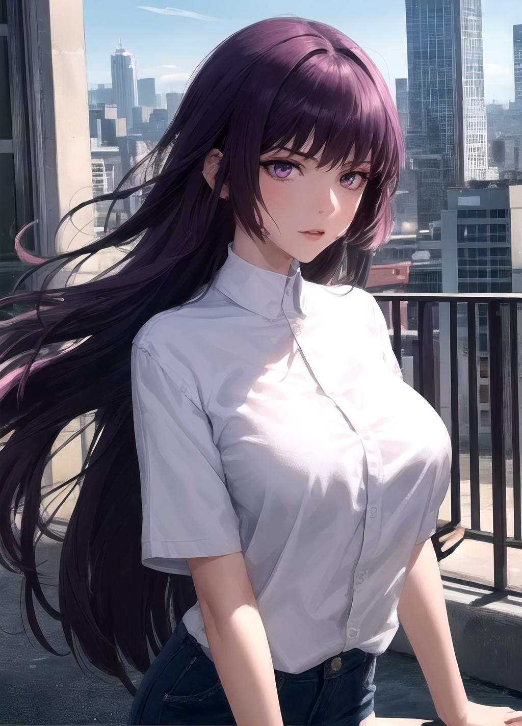 tags: <lora:Sana_Sunomiya_V1:0.7>, large breasts, purple hair, long hair, <lora:Sana_Sunomiya:1> , Sana Sunomiya, (purple eyes)