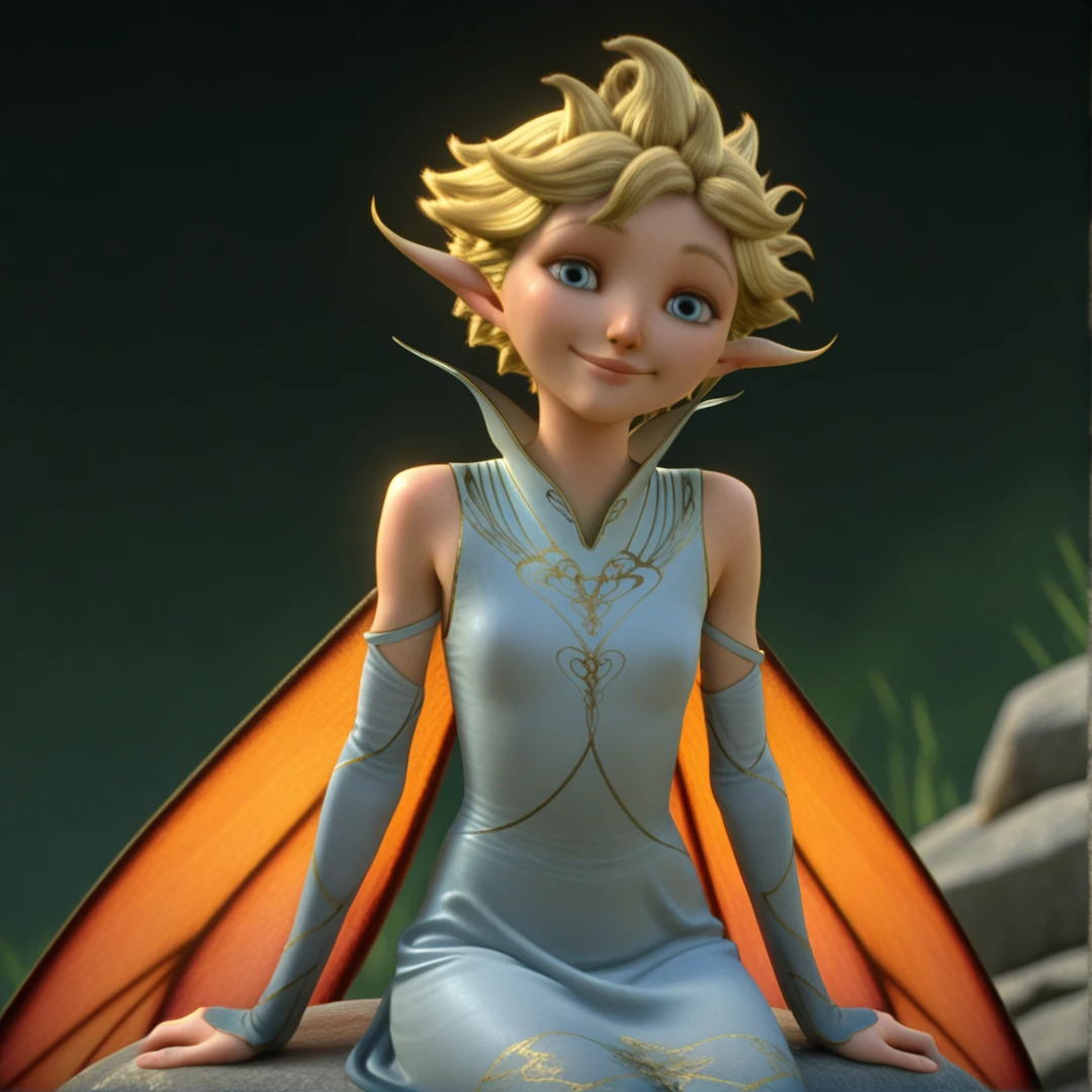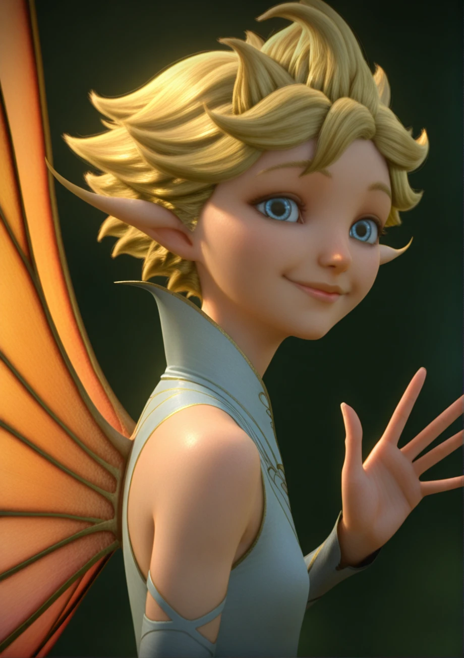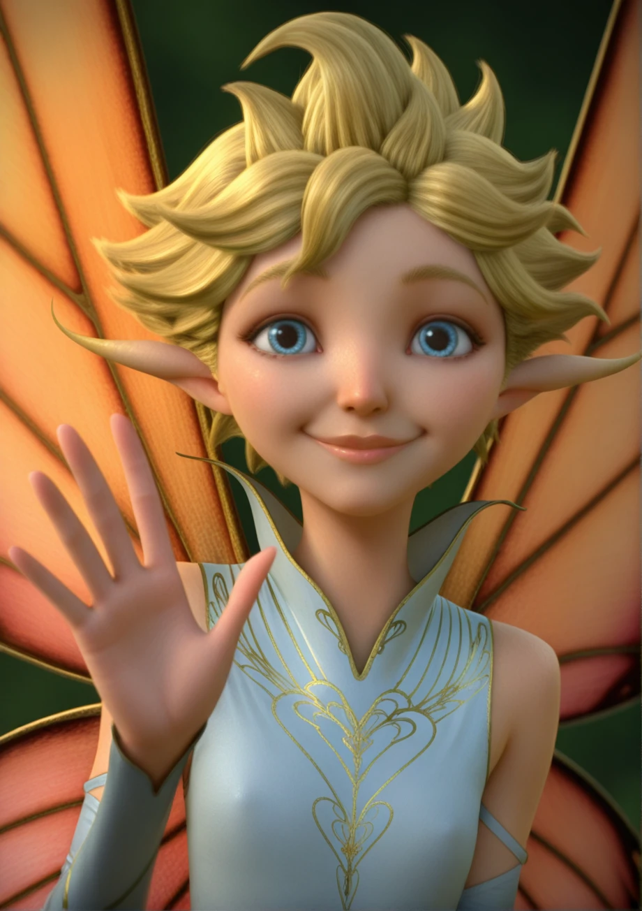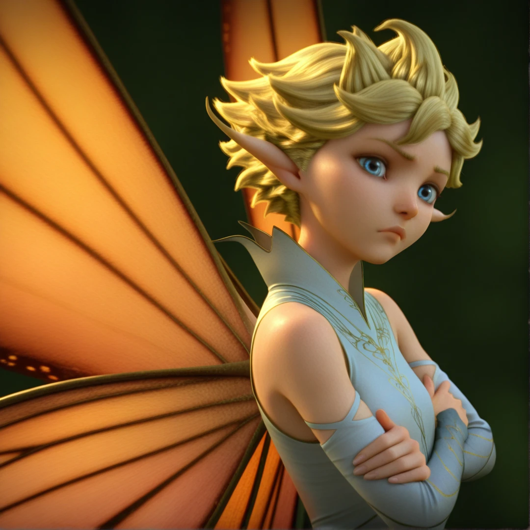 1girl, fairy, pointy ears, blue eyes, blonde hair, short hair, fairy wings
