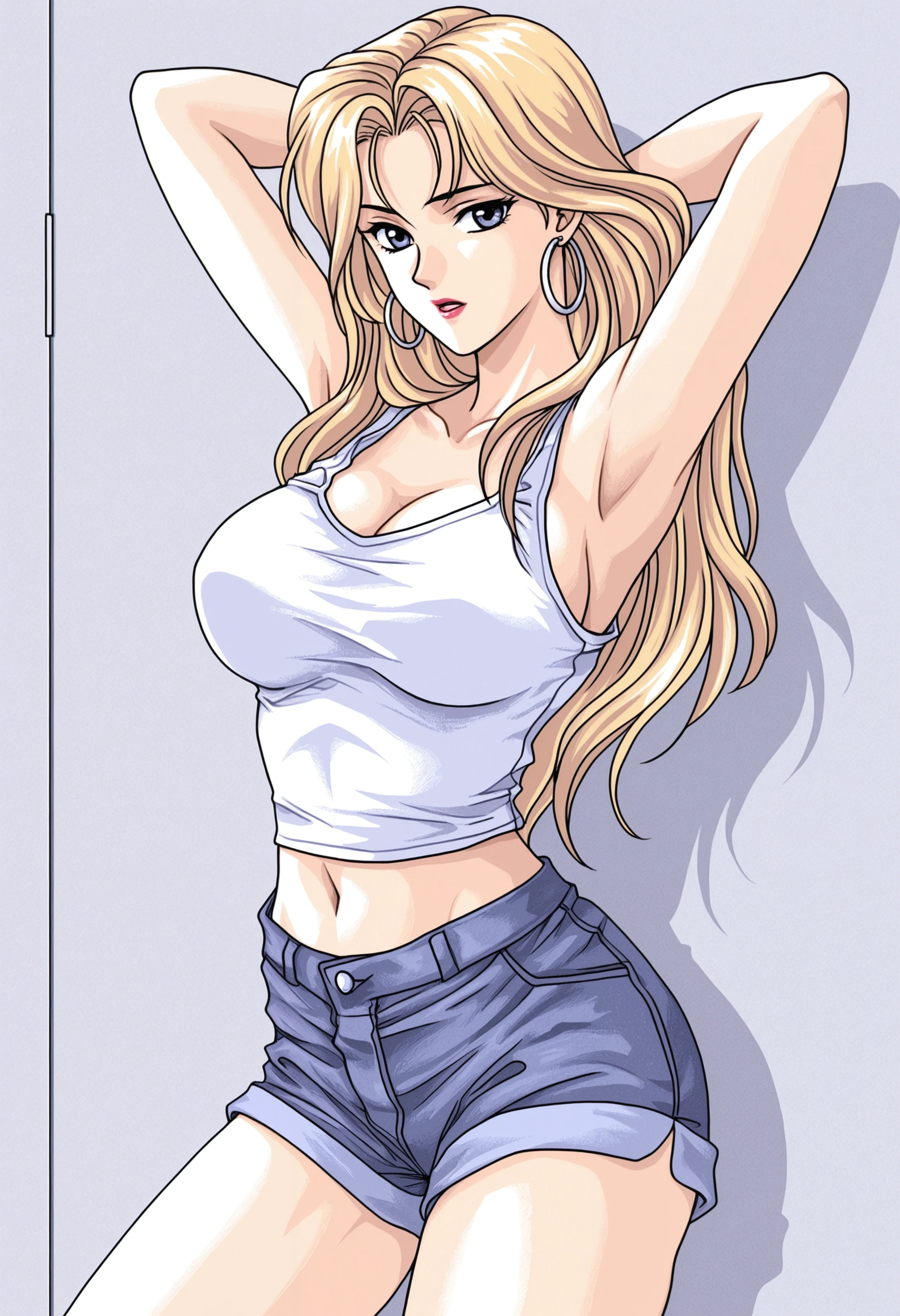 TetraKan_Los, blonde hair, long hair, hoop earrings, lipstick,
