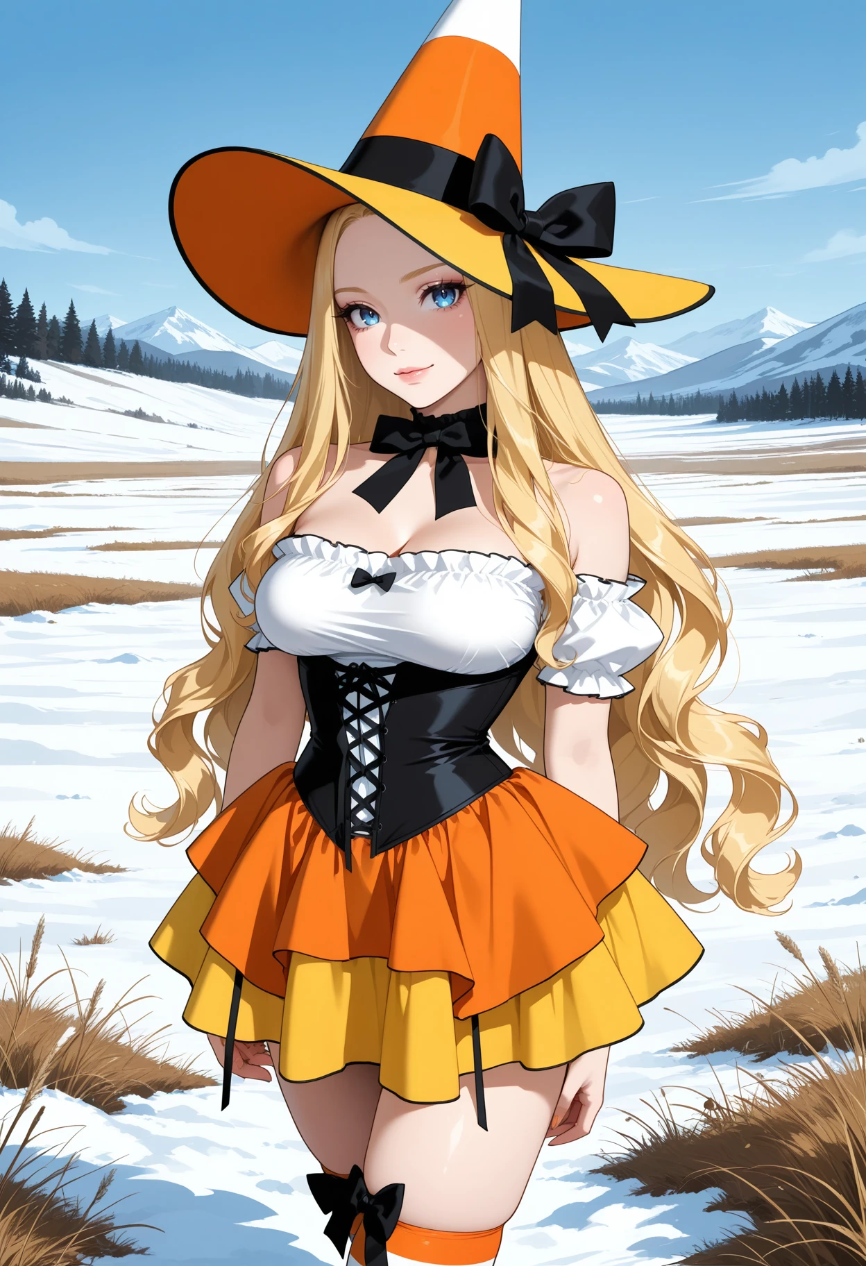 oversized hat, black hat, yellow hat, orange hat, white hat, multicolored hat, ???? shoulders, white shirt, frills, yellow skirt, orange skirt, corset, multicolored skirt, over-kneehighs, striped thighhighs, black shoes, (thighhigh bows)