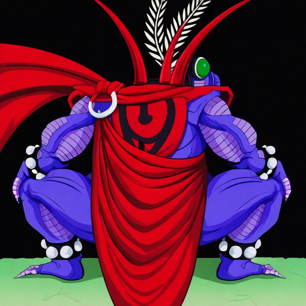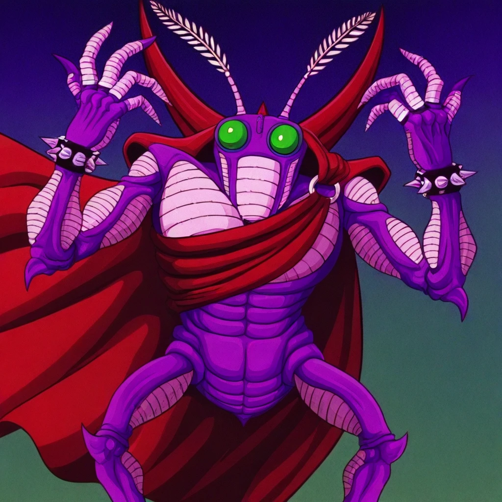 1boy,solo,red cape,red spikes,bracelet,green eyes,antennae,abdomen
