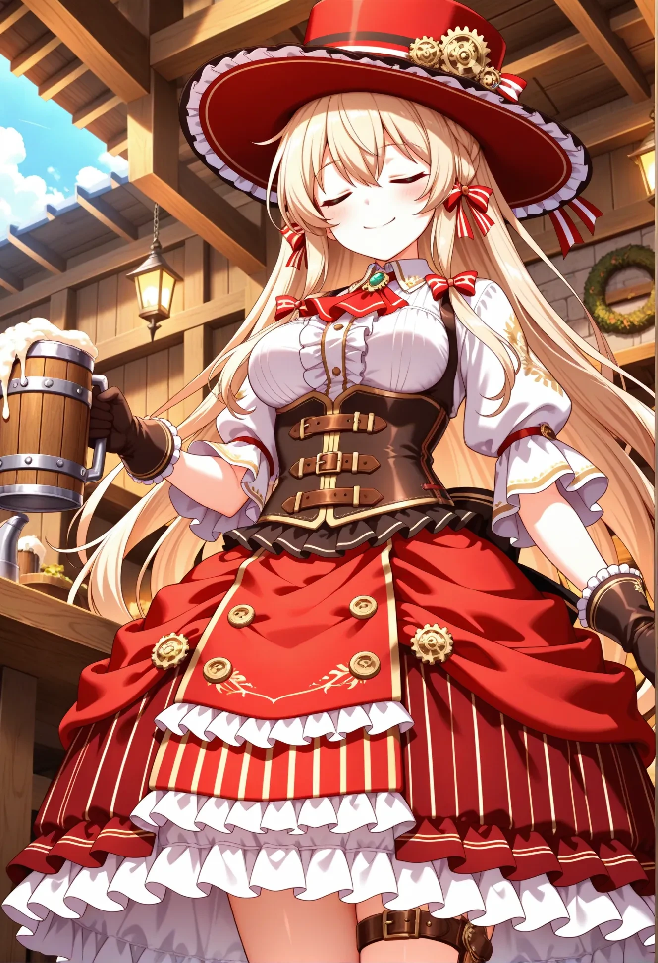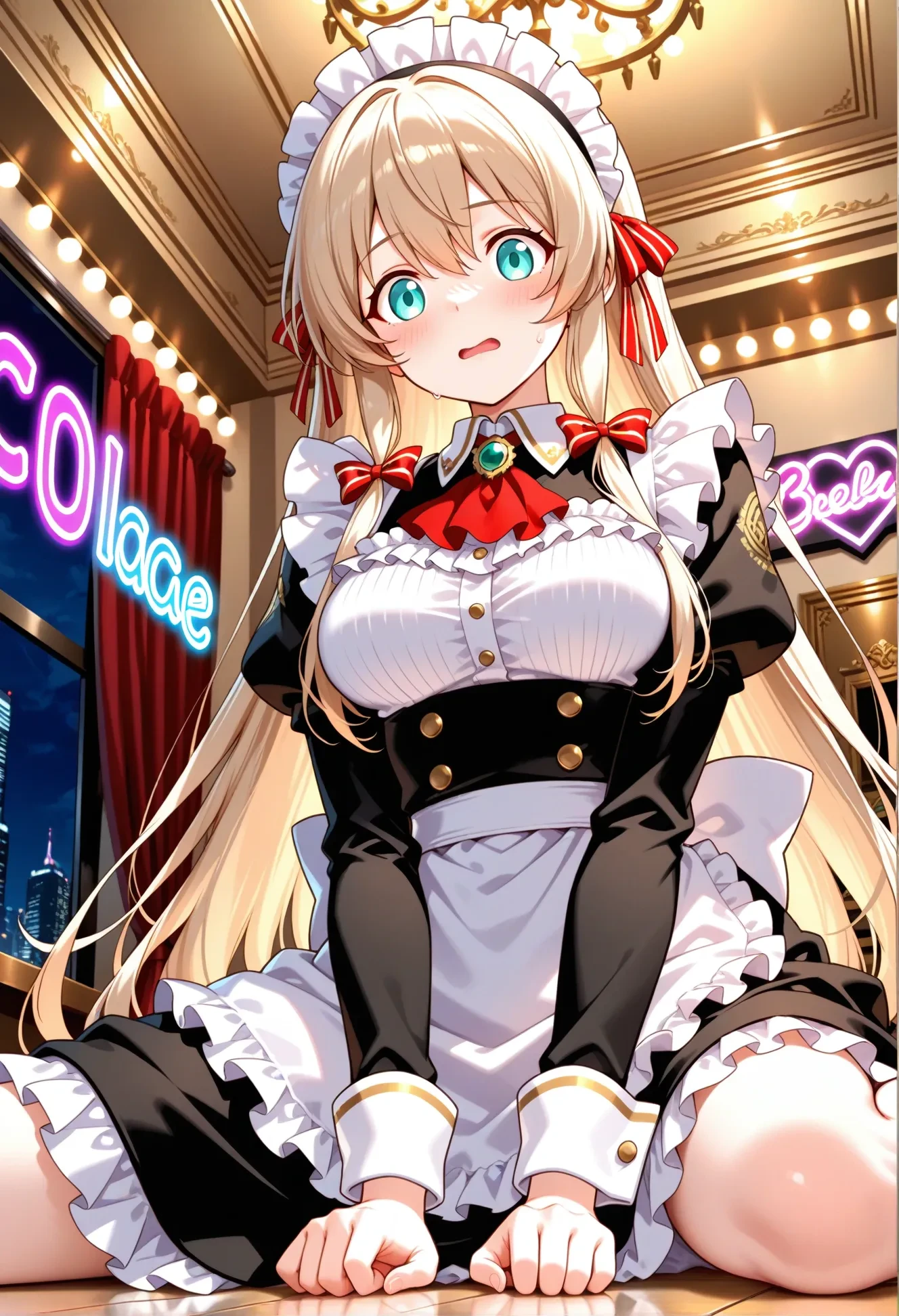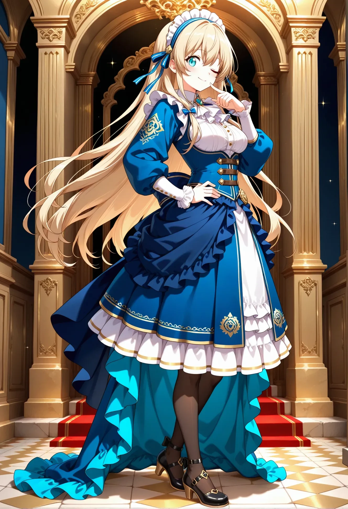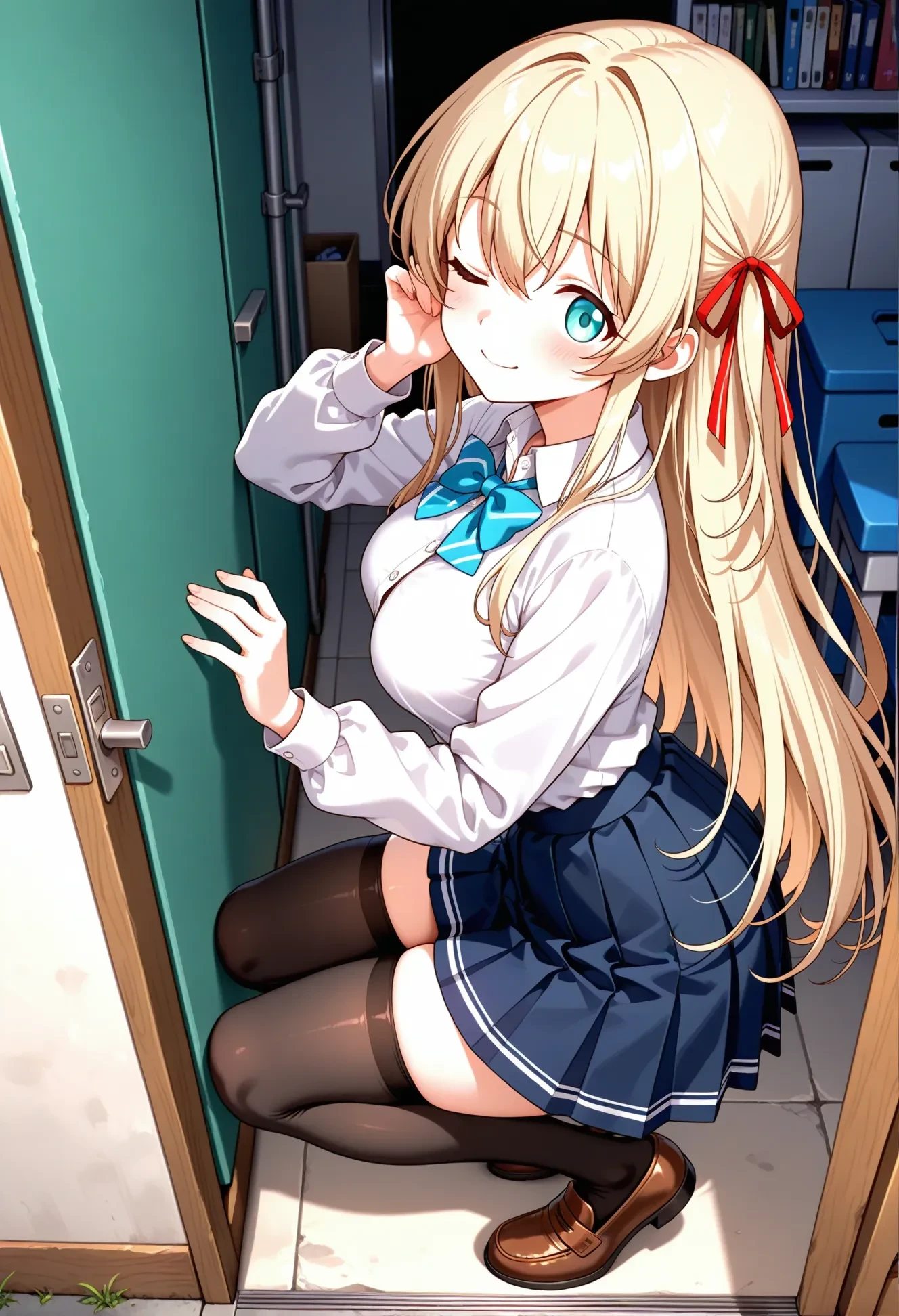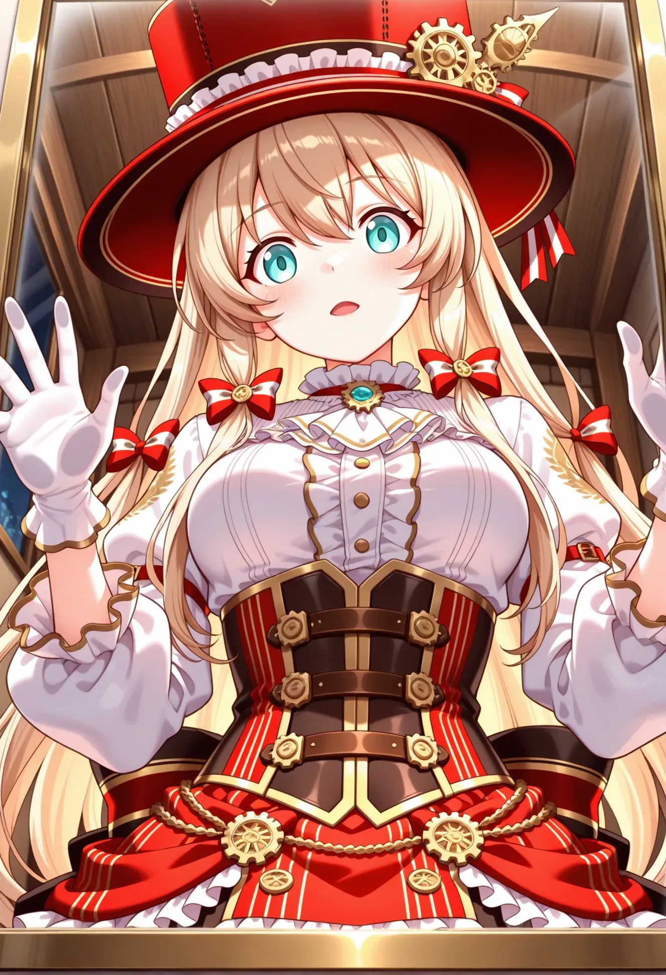 kurowizyukka,blonde hair,long hair,sidelocks,hair between eyes,hair ribbon,aqua eyes,medium breasts,