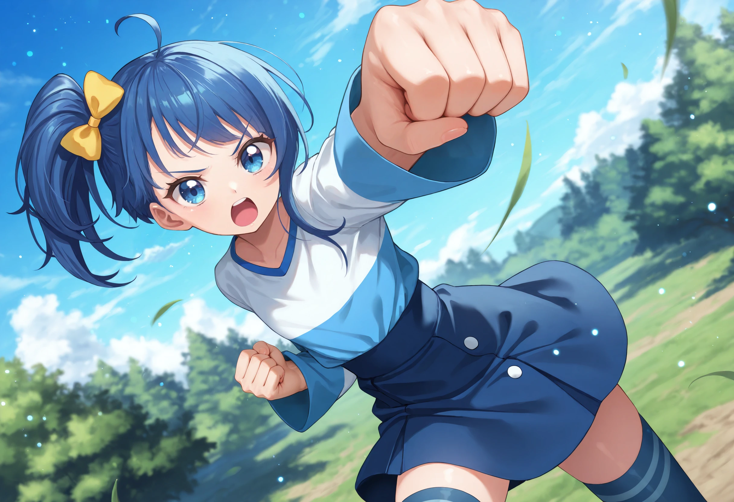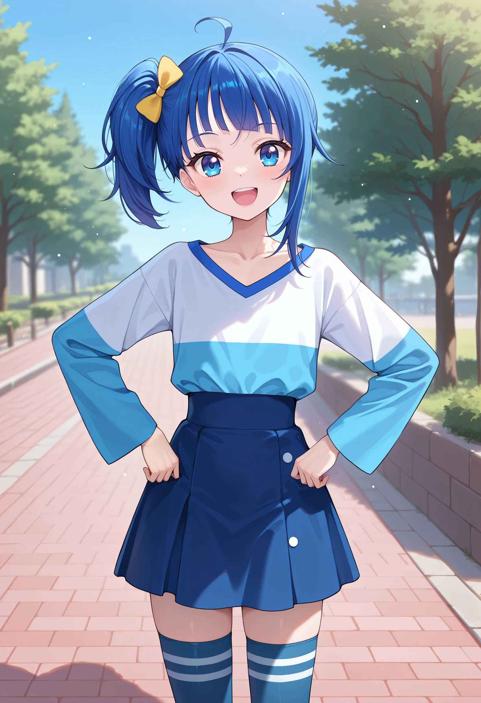 blue hair, side ponytail, ahoge, yellow hair bow, blue eyes, flat chest, cs_b_clothes, school uniform, blue jacket, white shirt, yellow breast ribbon, blue skirt, belt, white kneehighs, brown footwear