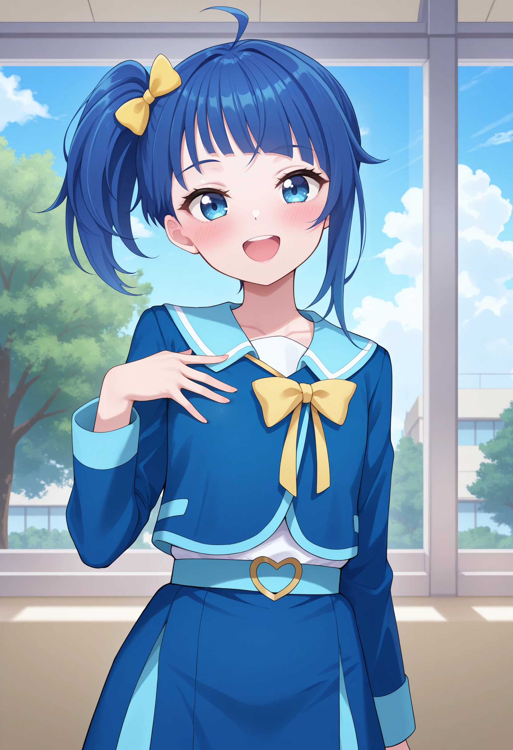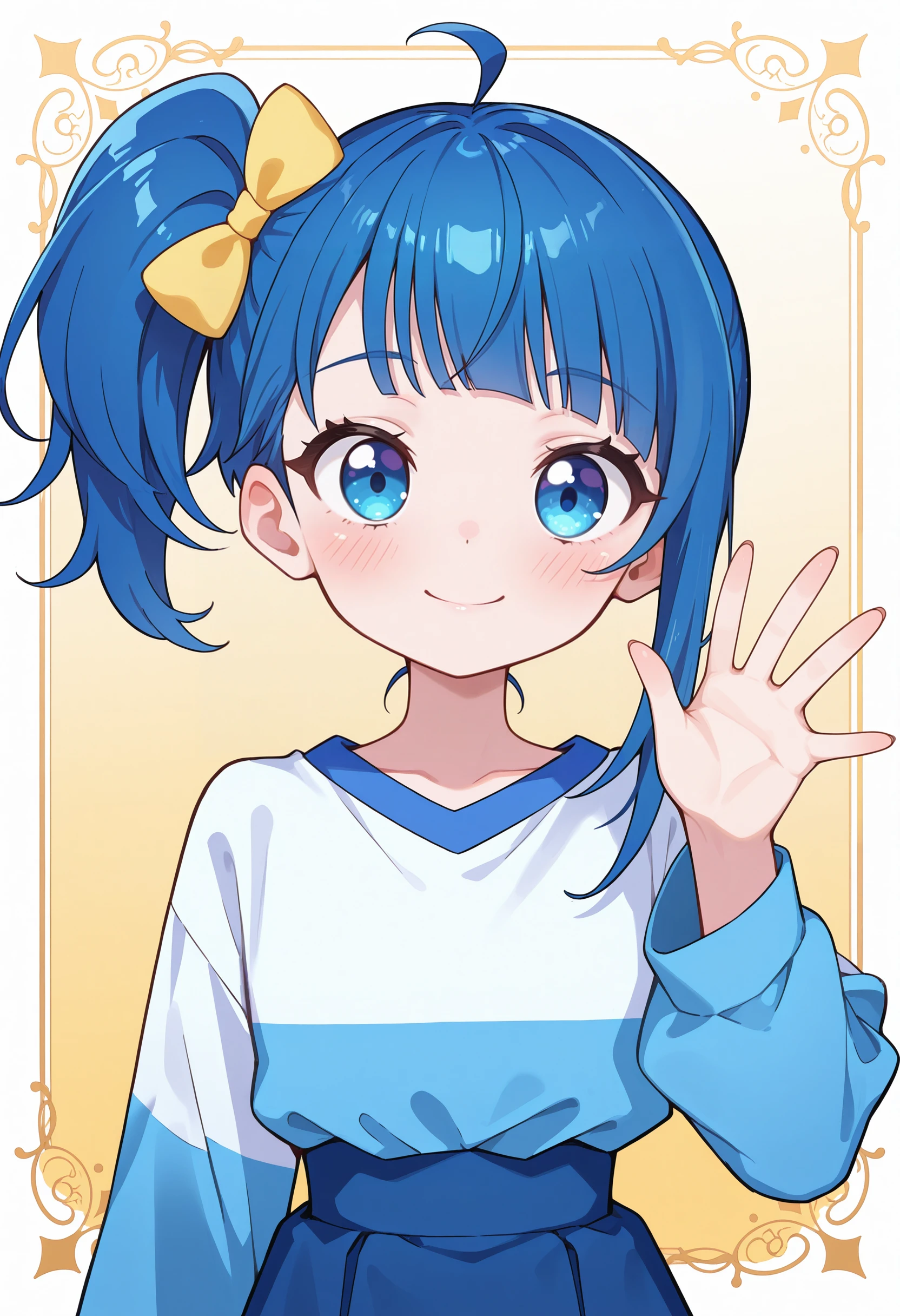 blue hair, side ponytail, ahoge, yellow hair bow,