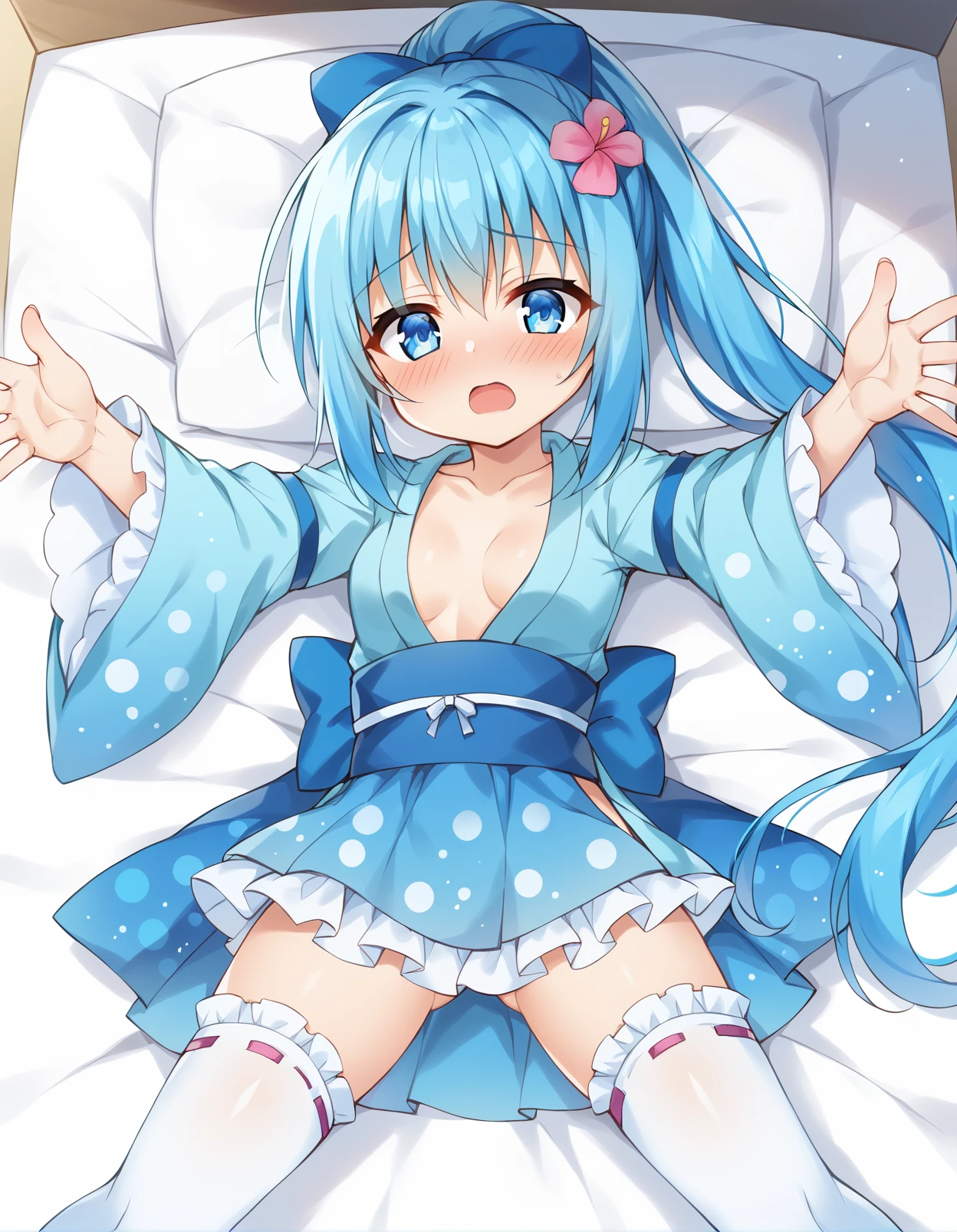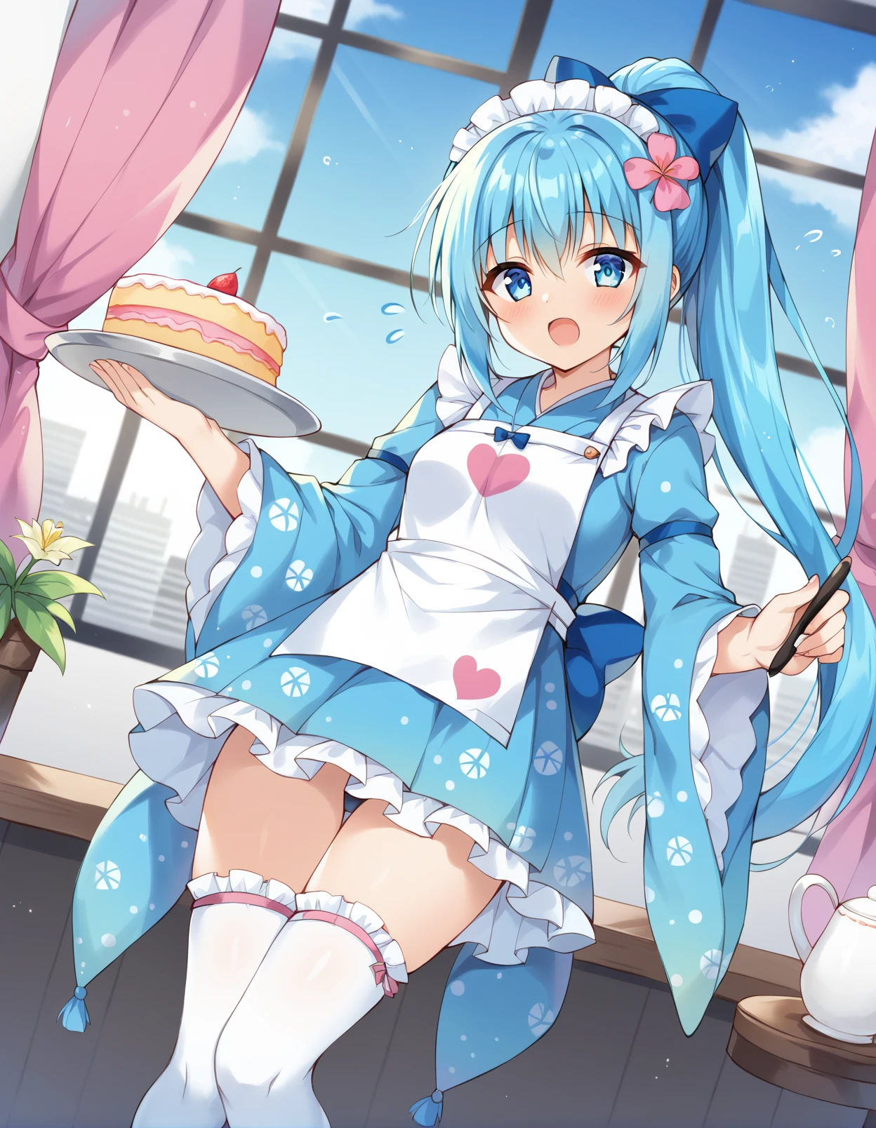 Kimono Costume: white headdress, print kimono, blue kimono, wide sleeves, long sleeves, heart print, white apron, frilled skirt, ribbon trim, frilled thighhighs, blue shoes