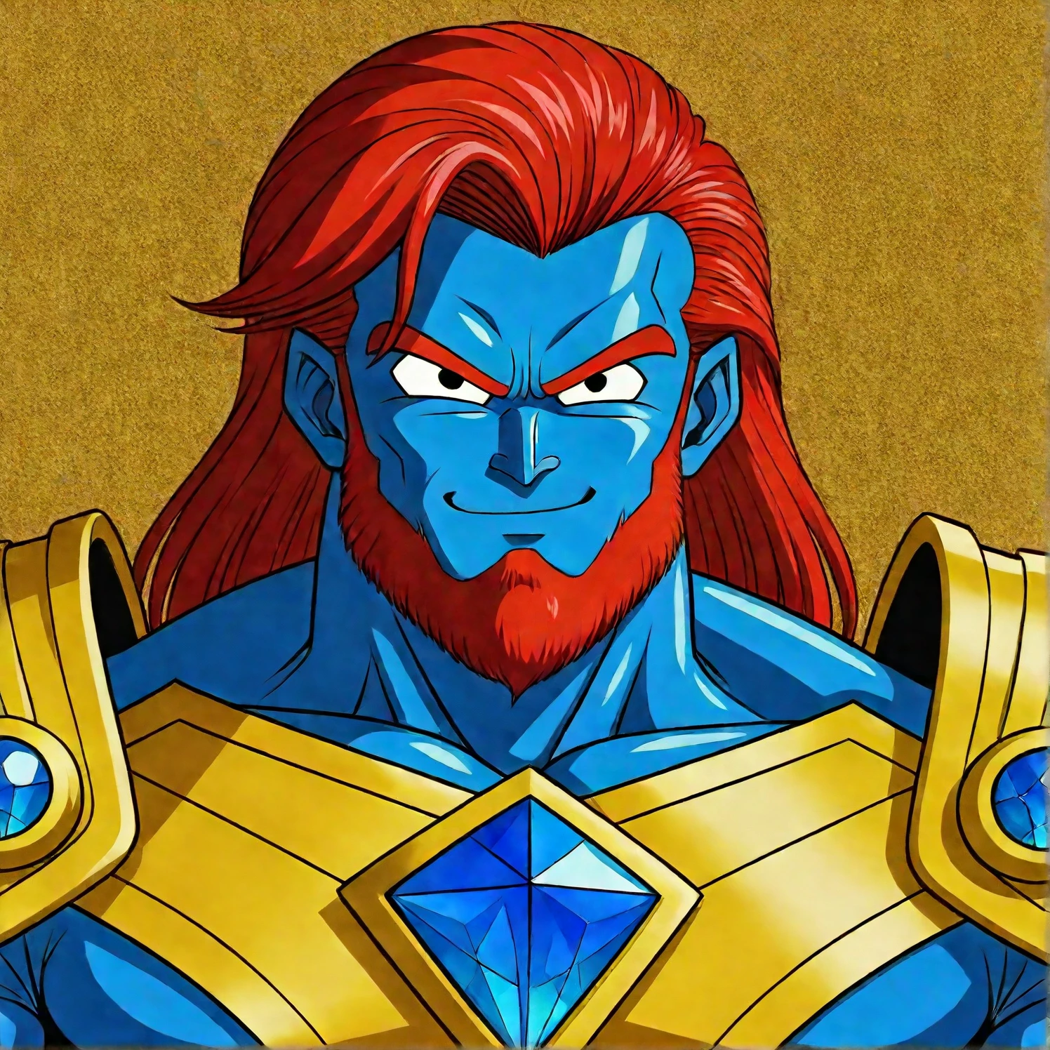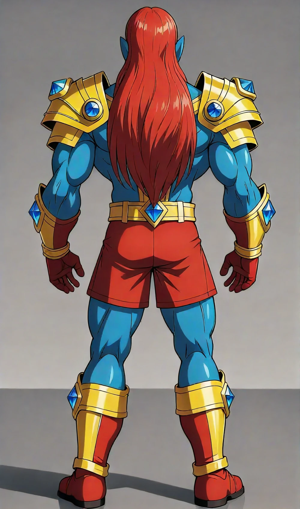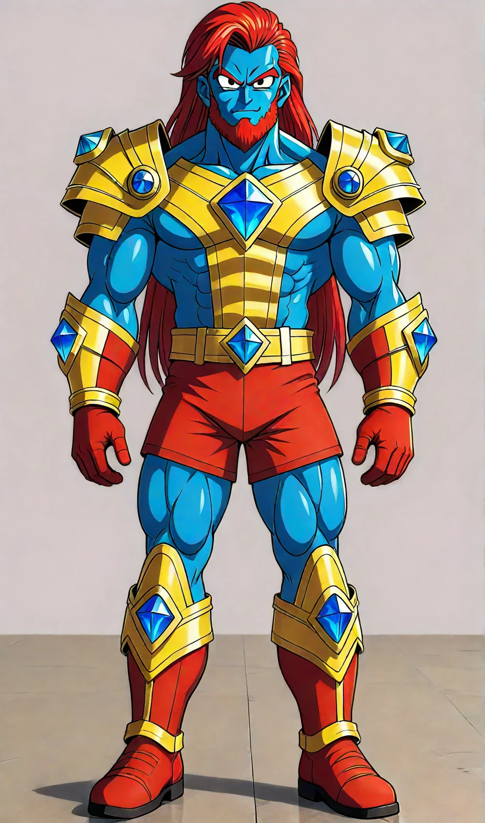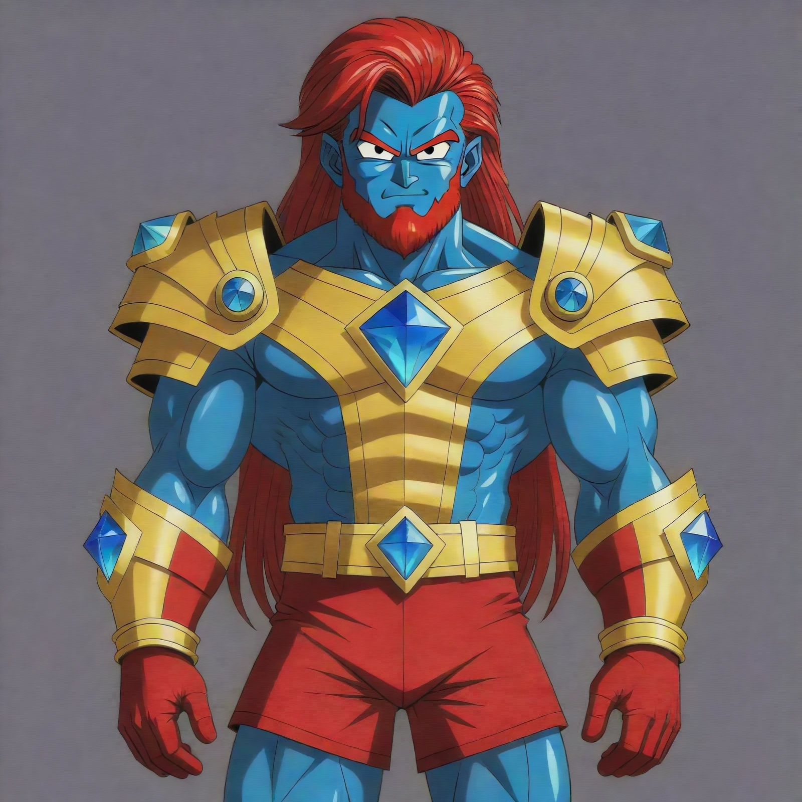 snapperzaff, tmsnapperzaff, snapperzafftm, male character, very muscular body, tall humanoid, full body, standing pose, front view, neutral stance, anime character, dragon ball inspired anime style, clean lineart, smooth anime shading, blue skin, long red hair reaching past the hips, thick chin beard along the jawline with clean upper lip, sharp eyebrows, human ears, golden smooth plate armor, t-shaped chest plate, double layered shoulder plates, embedded gemstones, large diamond gem, belt, shorts, leg armor with knee guards and shin armor, boots, symmetrical armor design
