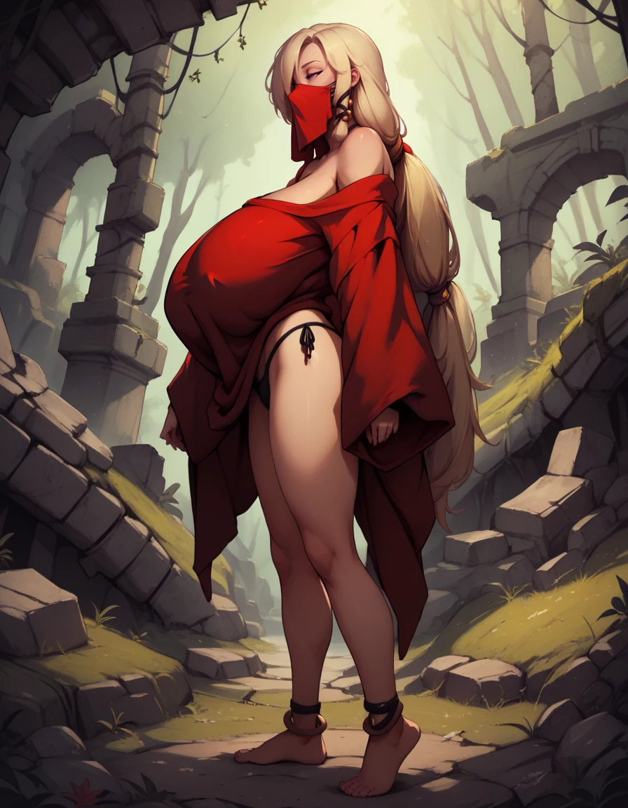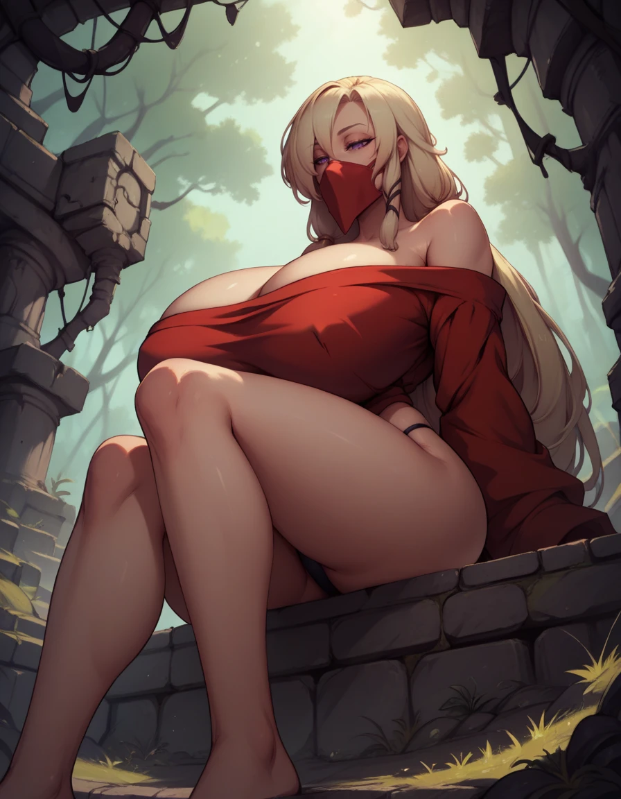 oversized clothes, black thong, red mask, off shoulder, mouth veil,