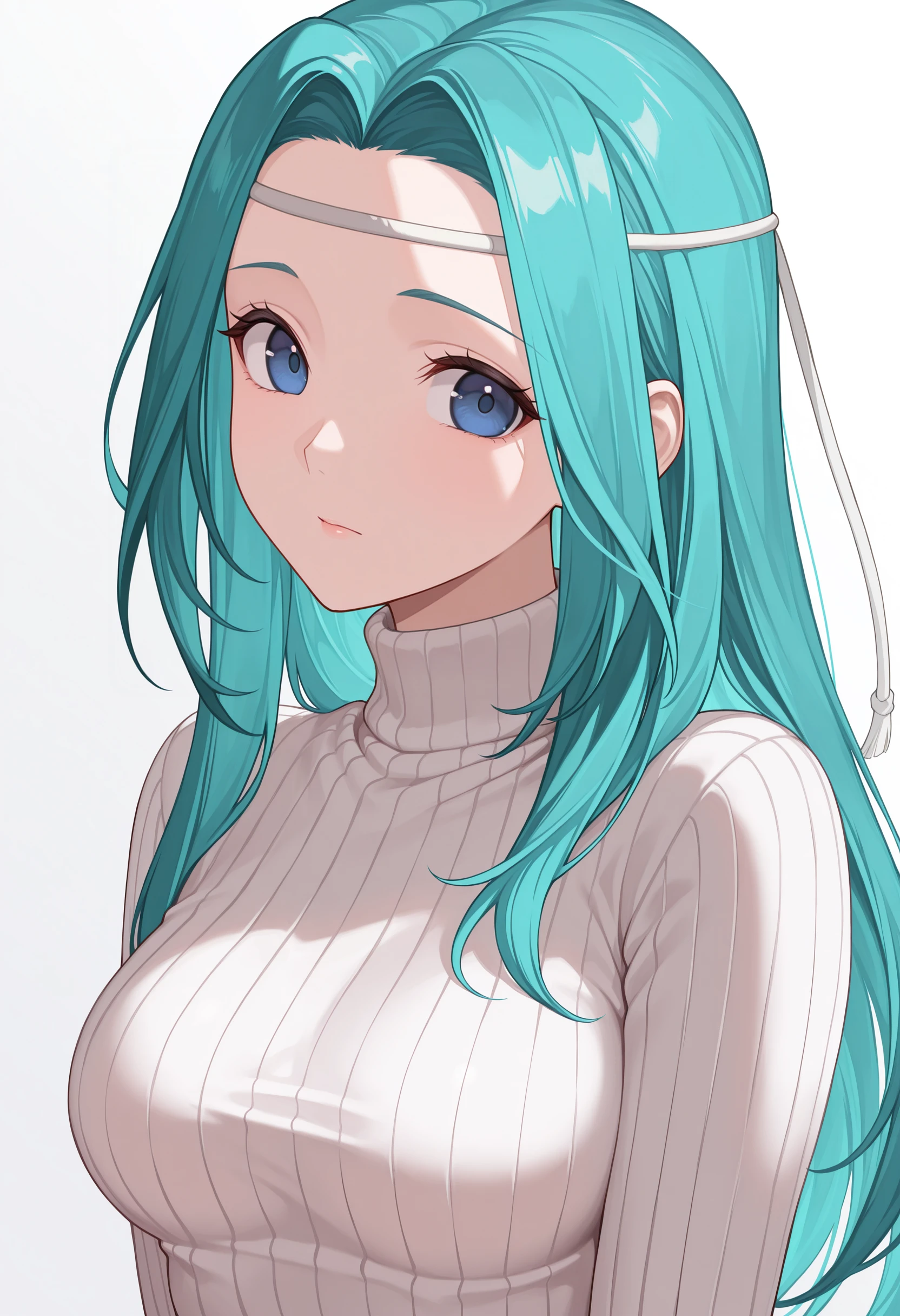 frff, blue eyes, aqua hair, long hair, white headband, blue armor, shoulder armor, breastplate, white dress, short dress, blue gloves, elbow gloves, fingerless gloves, brown belt, blue boots, thigh boots