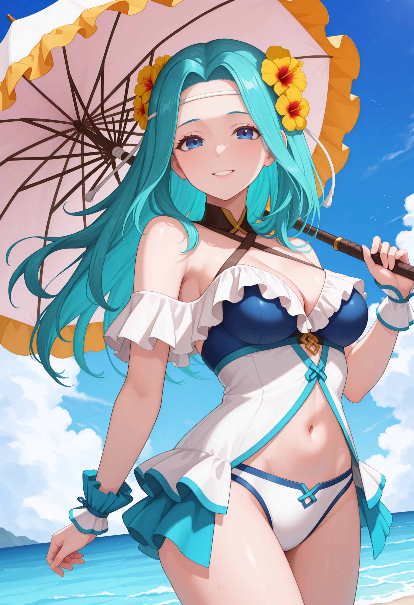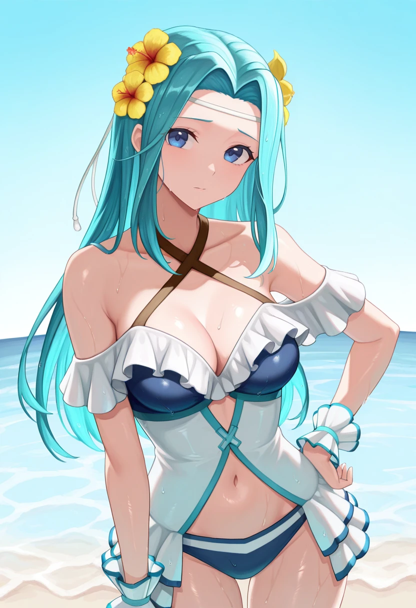 frss, blue eyes, aqua hair, long hair, hair flower, white headband, medium breasts, cleavage, blue bikini, white bikini, criss-cross halter, frilled bikini, bare shoulders, navel, wrist cuffs
