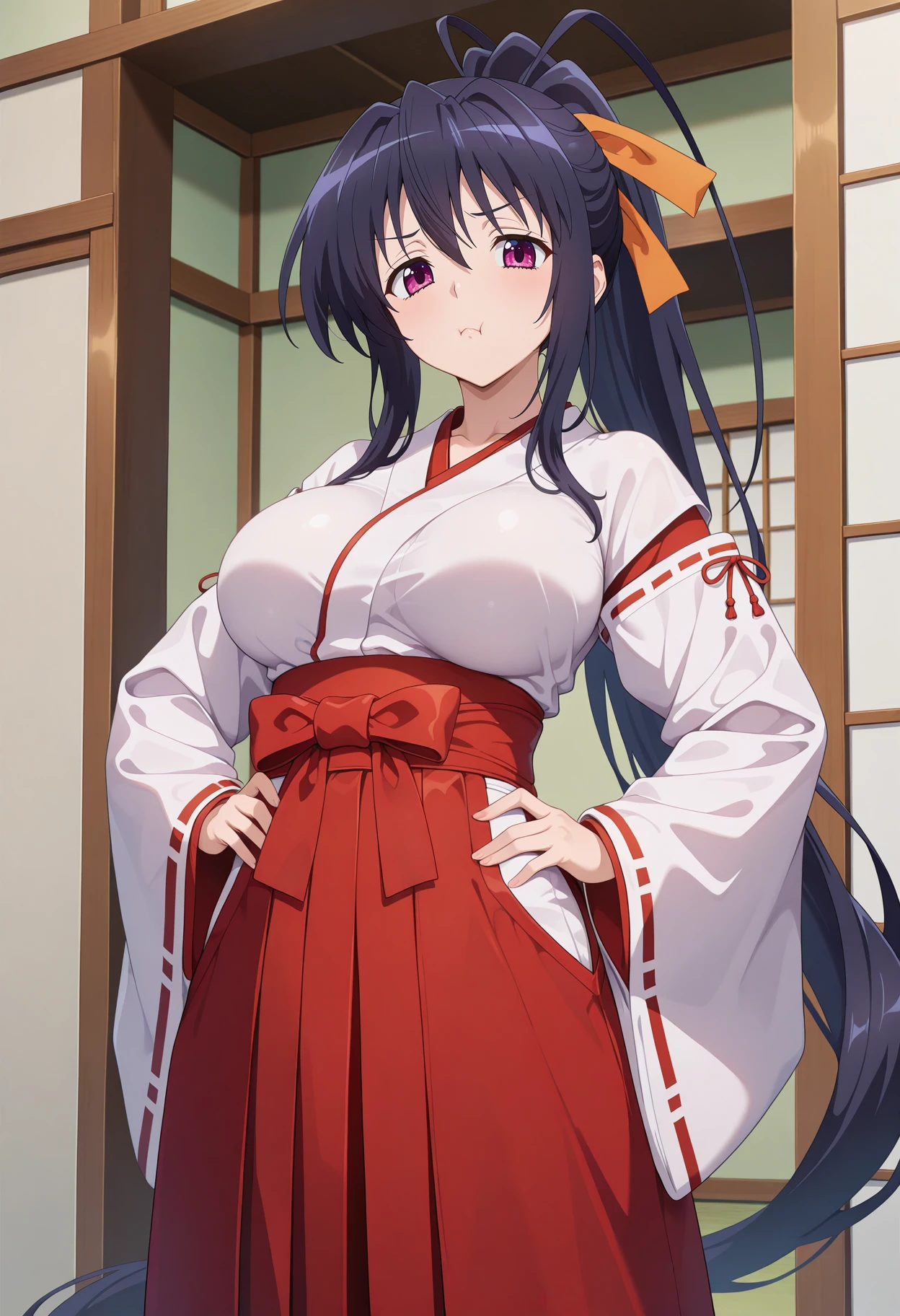 aaakeno, very long hair, black hair, ponytail, hair ribbon, orange ribbon, purple eyes, miko, white kimono, long sleeves, wide sleeves, hakama skirt, red hakama