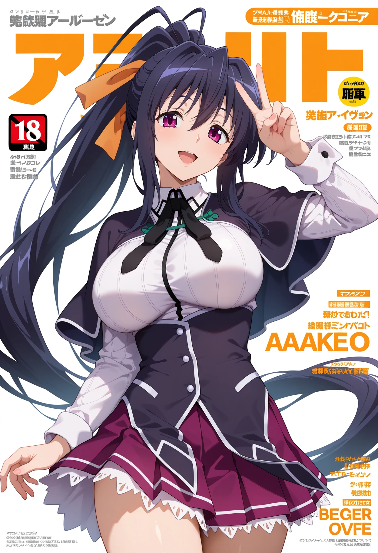 aaakeno, very long hair, black hair, ponytail, hair ribbon, orange ribbon, purple eyes, school uniform, neck ribbon, black capelet, collared shirt, white shirt, long sleeves, underbust, black dress, miniskirt, purple skirt