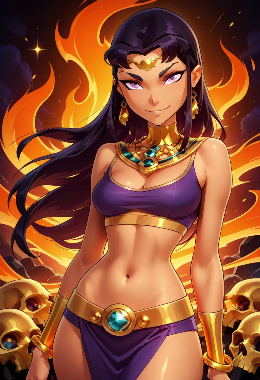 zzBlkFr, zzCitronColors, smile, purple eyes, navel, cleavage, bare shoulders, jewelry, medium breasts, cowboy shot, earrings, midriff, belt, necklace, stomach, bracelet, crop top, thick eyebrows, fire, pelvic curtain, skull, gold, gold trim, (usekh collar). circlet,