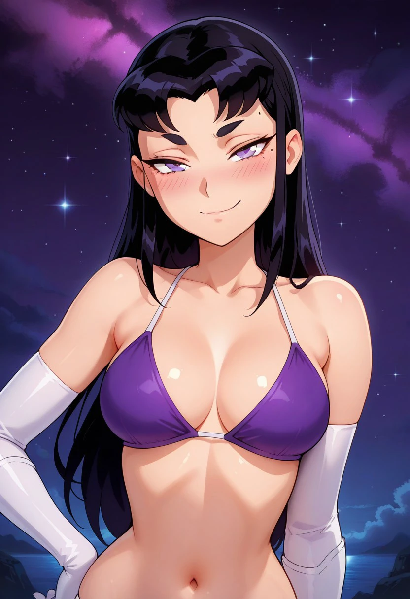 zzBlkFr, purple eyes, black hair, long hair, armor, leotard, thigh strap, saiyan armor,