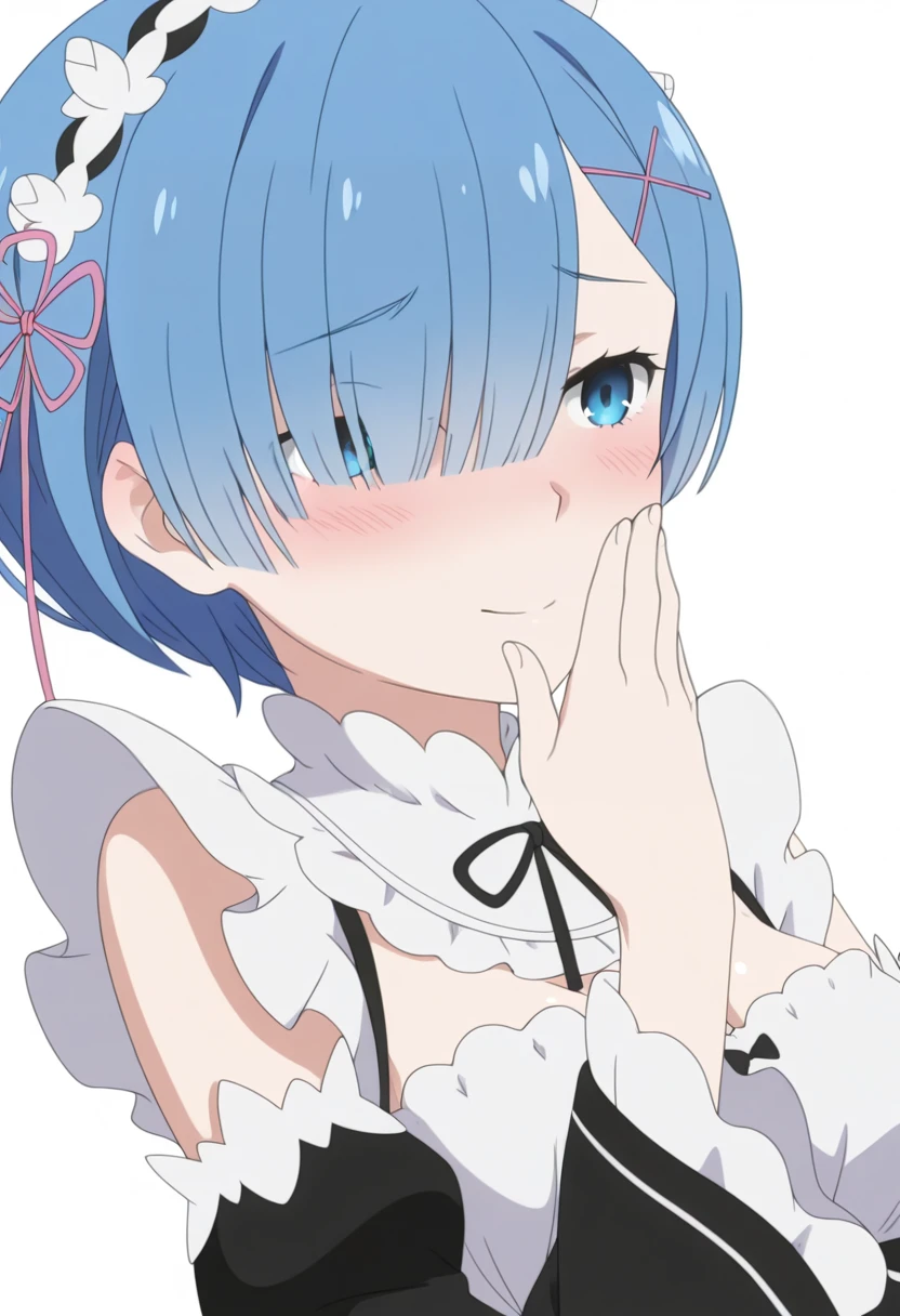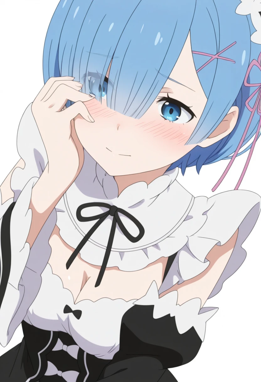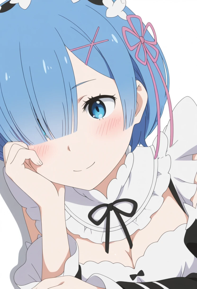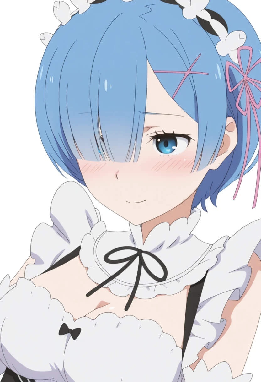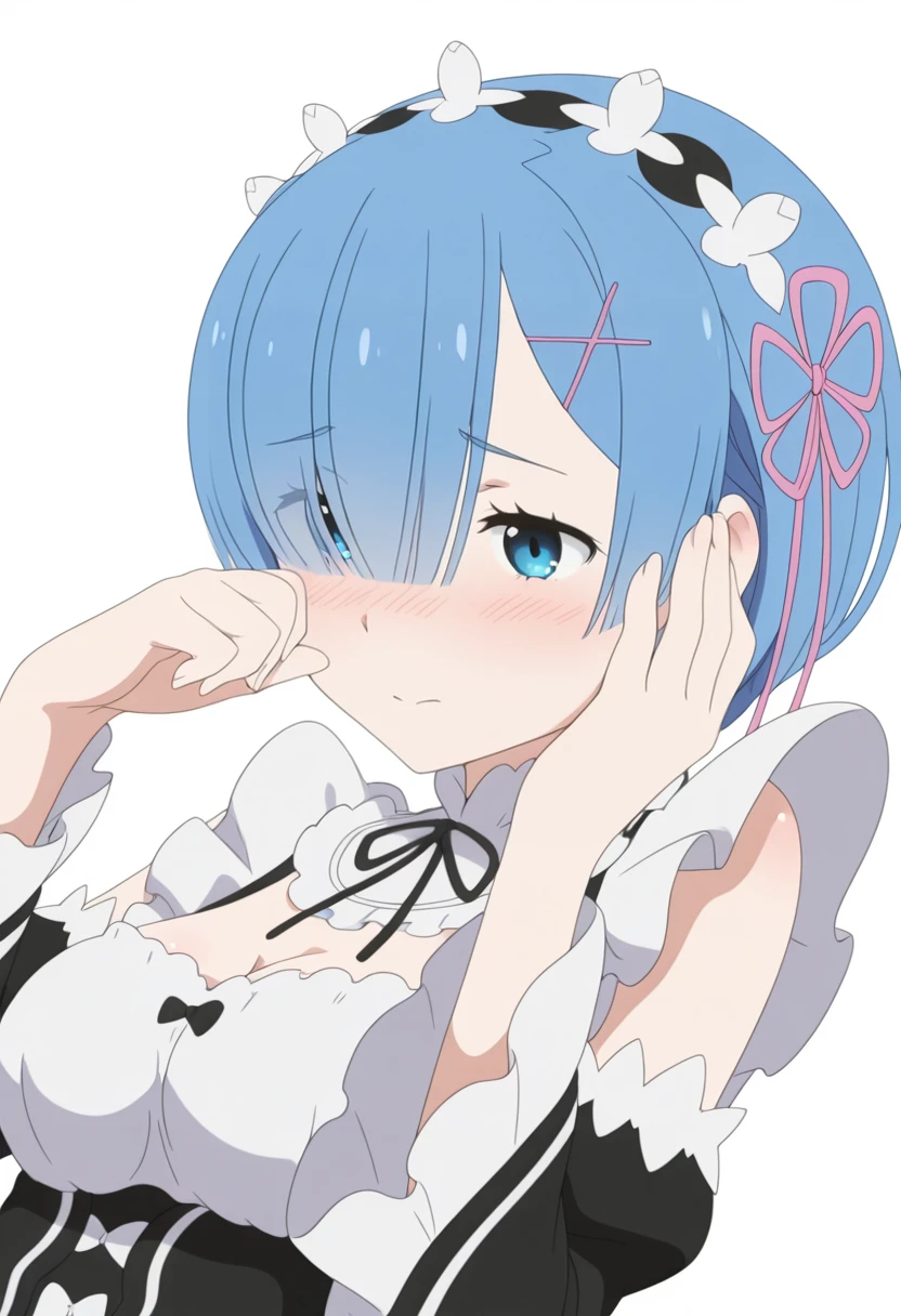 r2m, roswaal mansion maid uniform, blue hair, blue eyes, short hair, hair over one eye, x hair ornament, detached sleeves, hair ribbon, maid headdress, medium breasts, pink ribbon, cleavage, apron