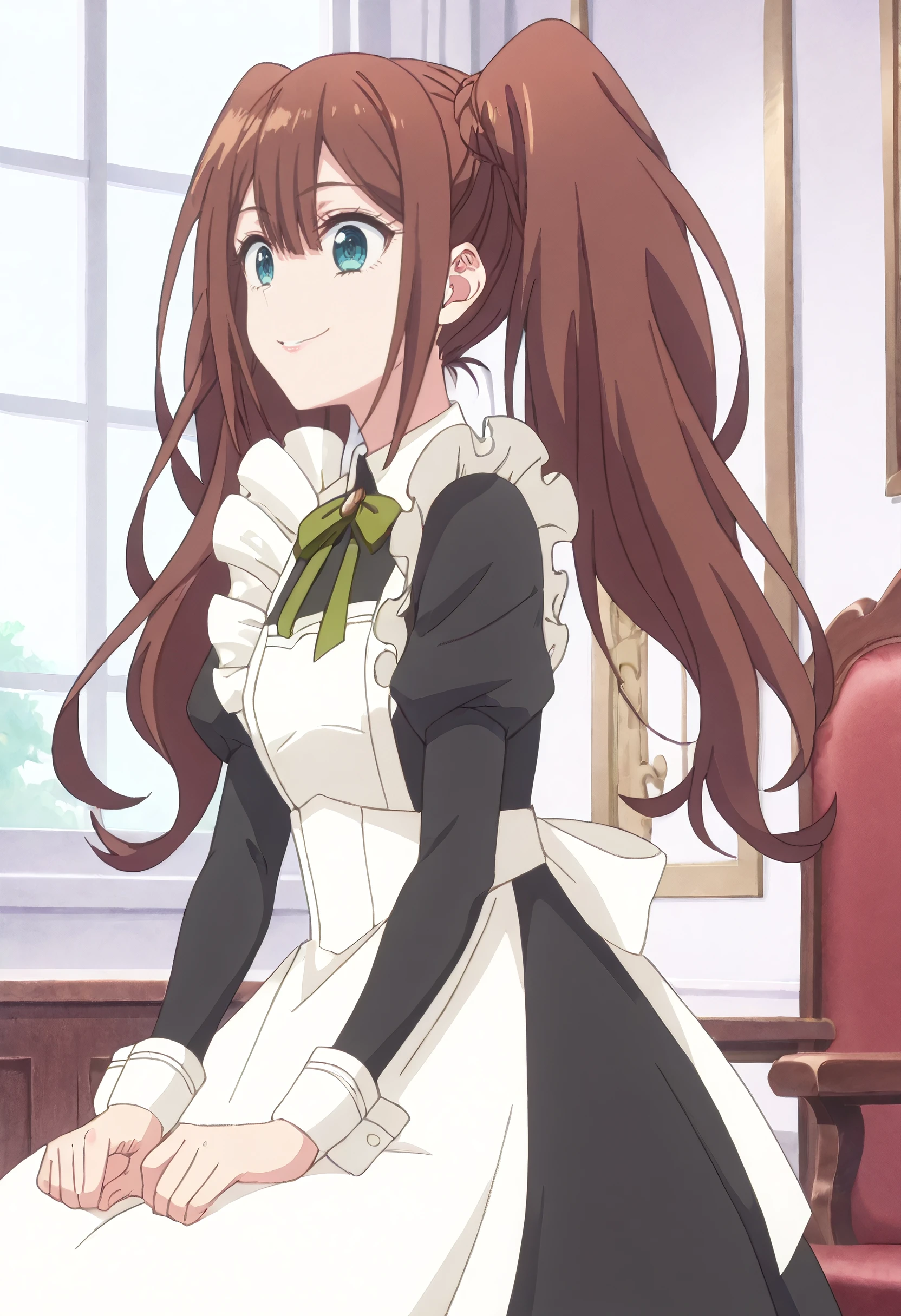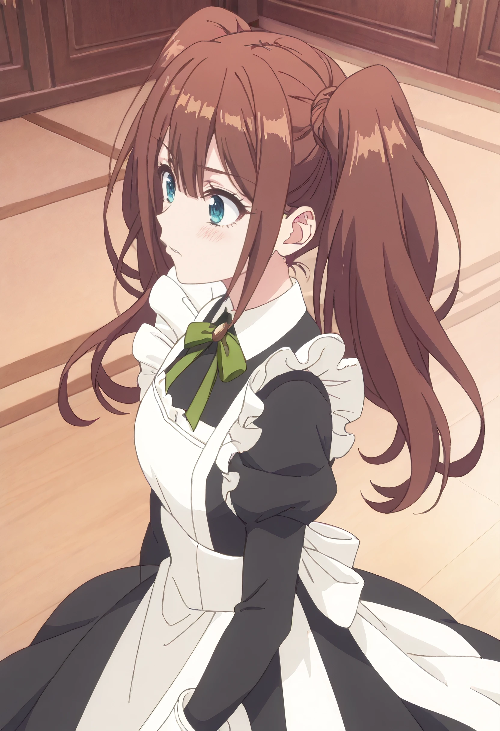 LenaOutfit, maid, apron, maid headdress, maid apron, black dress, white apron, dress, frills, frilled apron, enmaided, ribbon, green ribbon, bow, long sleeves, puffy sleeves, neck ribbon, juliet sleeves, collared dress, green bow, sleeve cuffs, back bow,