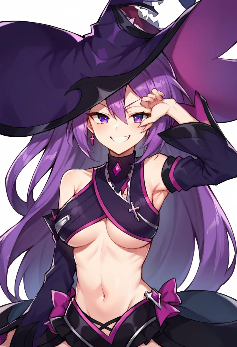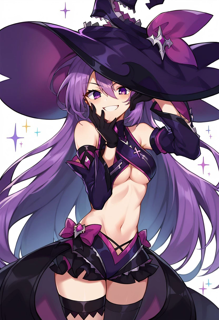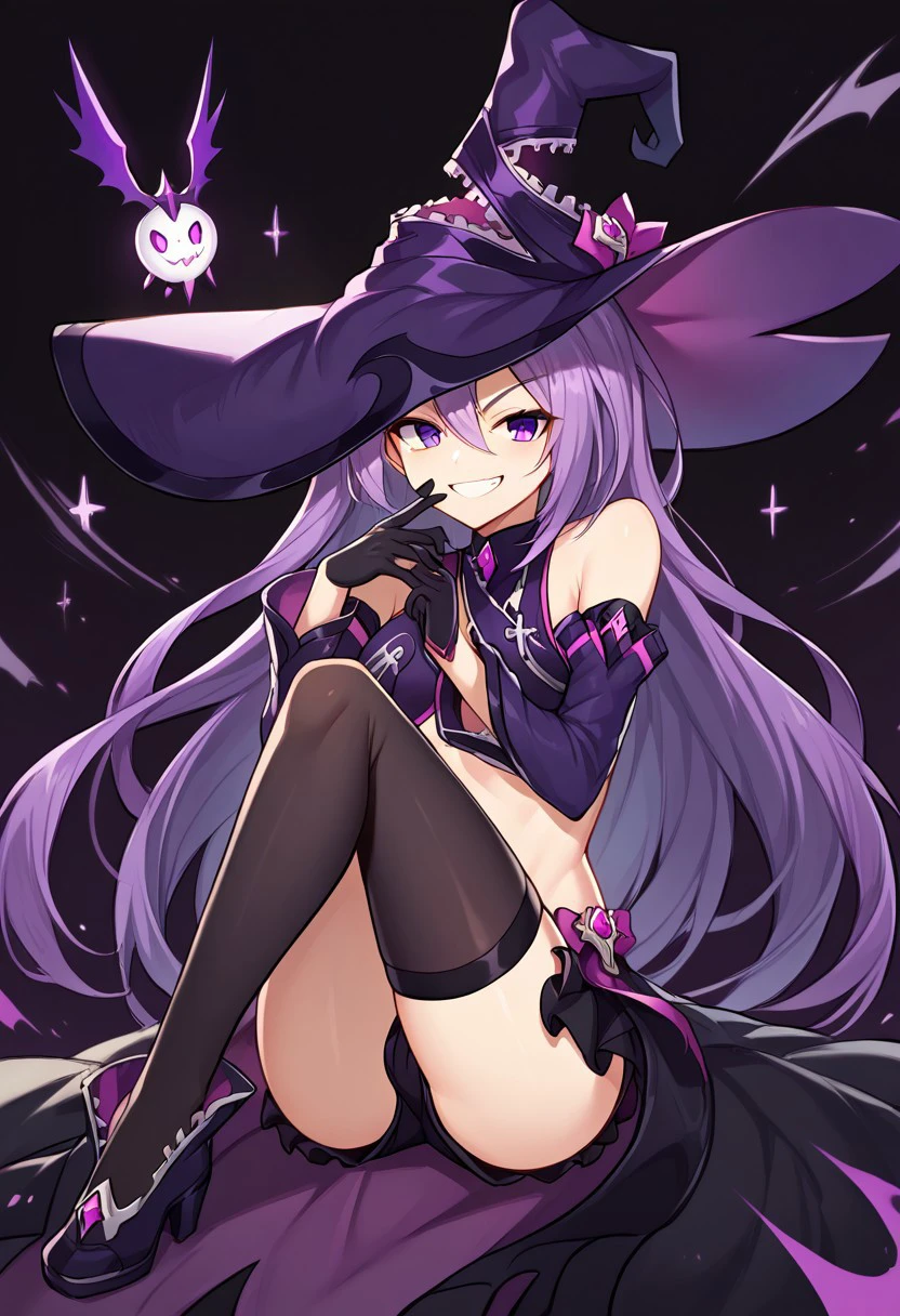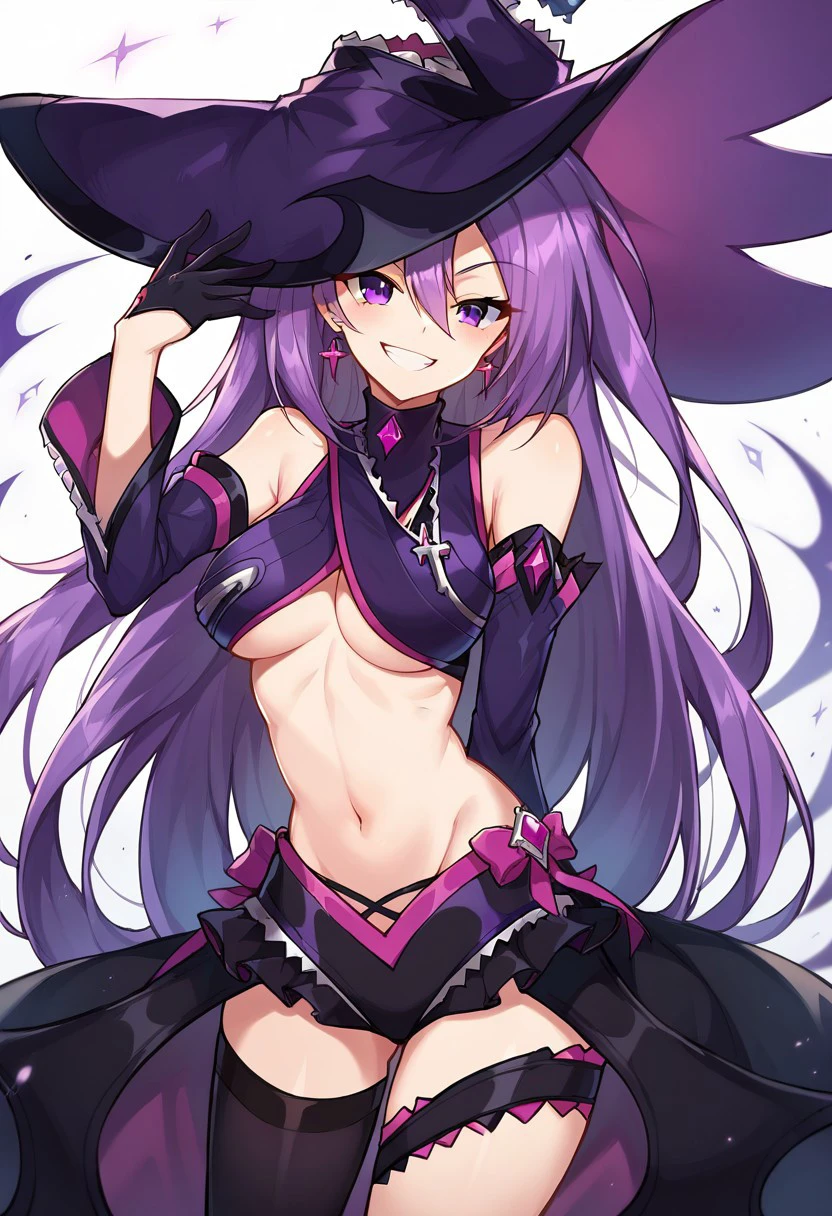 revealing clothes, asymmetrical legwear, purple footwear, purple gloves, purple hat, black thighhighs, detached sleeves, elbow gloves, frills, gloves, hat, mismatched legwear, shorts, short shorts, single elbow glove,