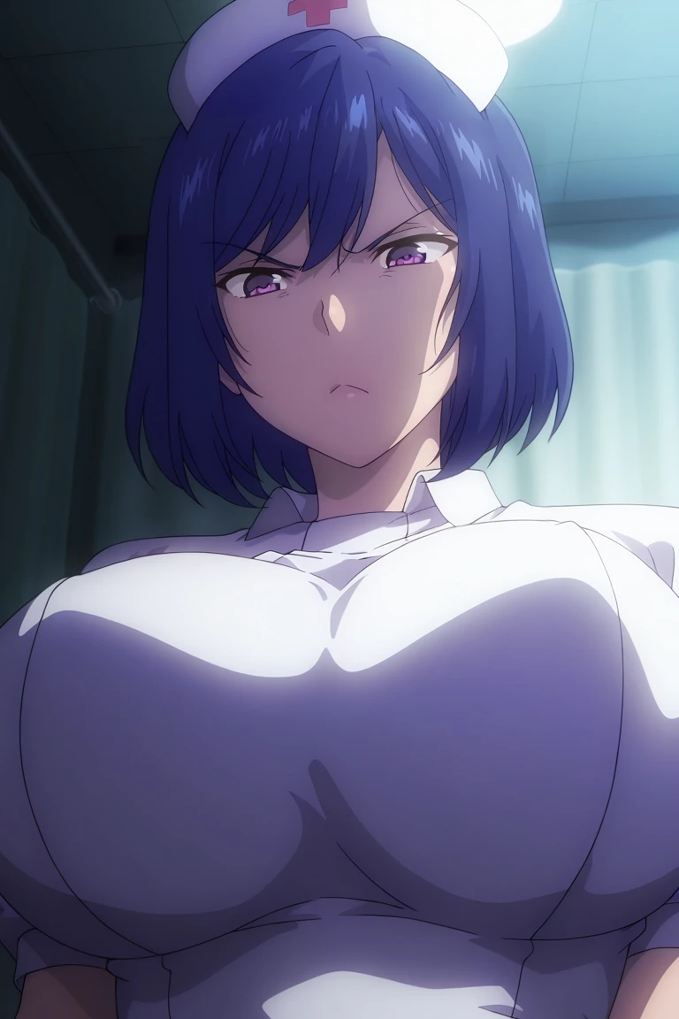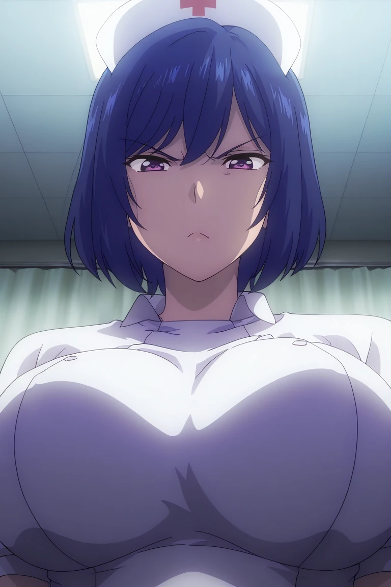 1girl, Tachibana, blue hair, short hair, purple eyes, glossy lips, big breasts, sexy, curvy, wide hips, thick thighs, official_style, anime_coloring