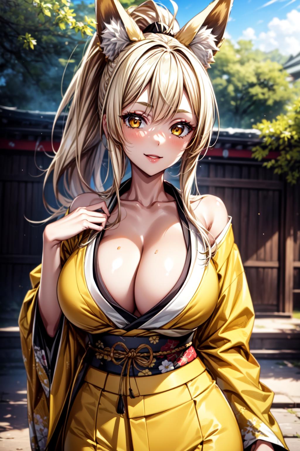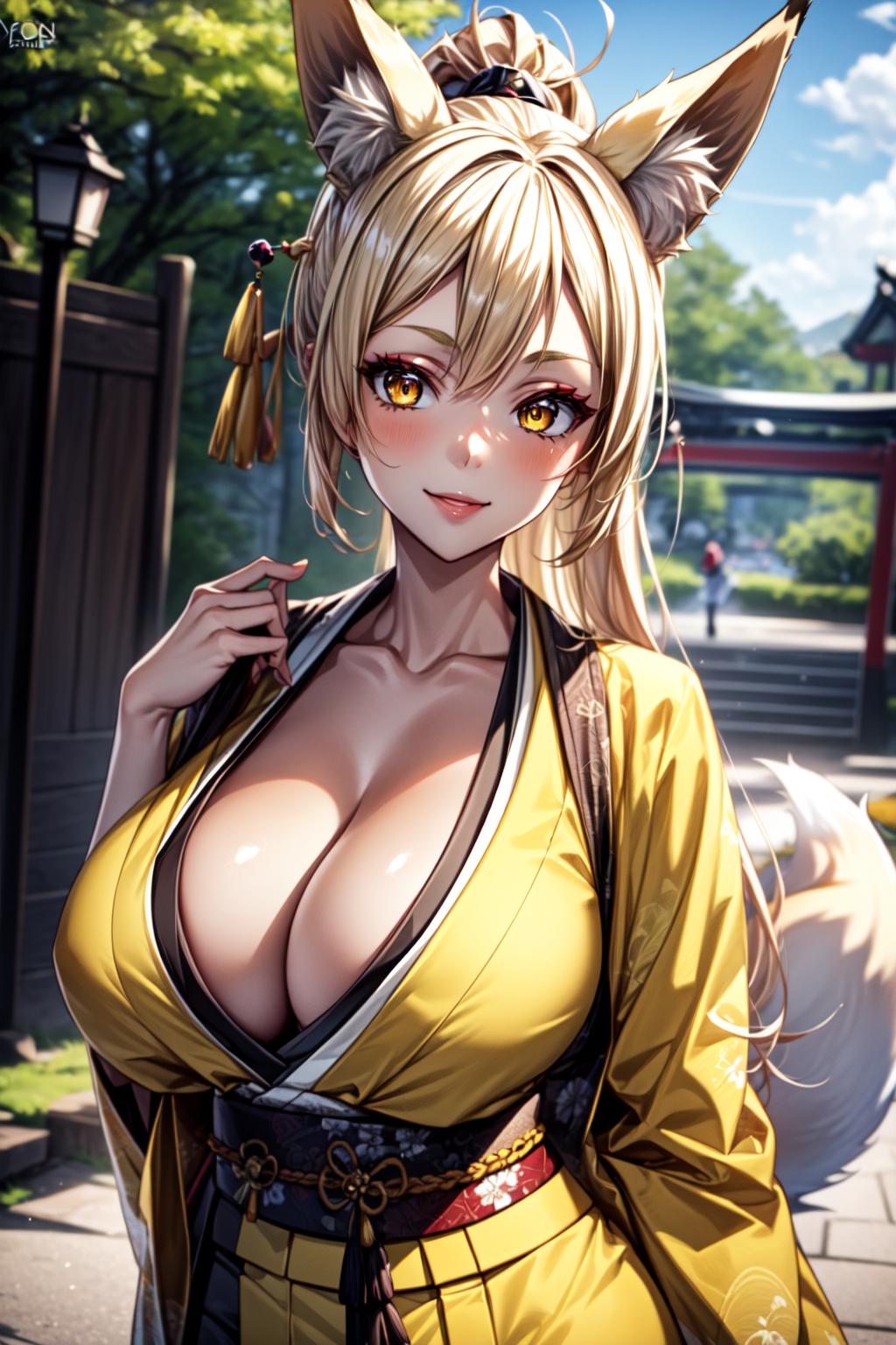 Yasaka_NDV, 1girl, blonde hair, large breasts, long hair, ponytail, fox ears, fox tails, yellow eyes, japenese clothes, cleavage, kimono, makeupBest weight: 0.6-0.8