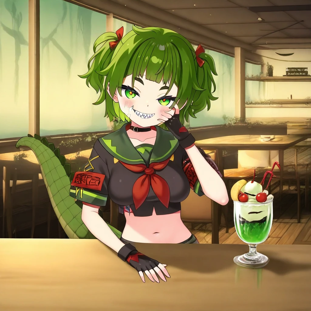 NityaNil, Nitya, 1girl, green eyes, green hair, short hair, two side up, pointy ears, sharp teeth, medium breast, smile at viewer, black choker, black serafuku, school uniform, fingerless gloves