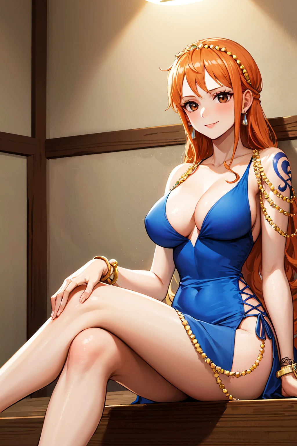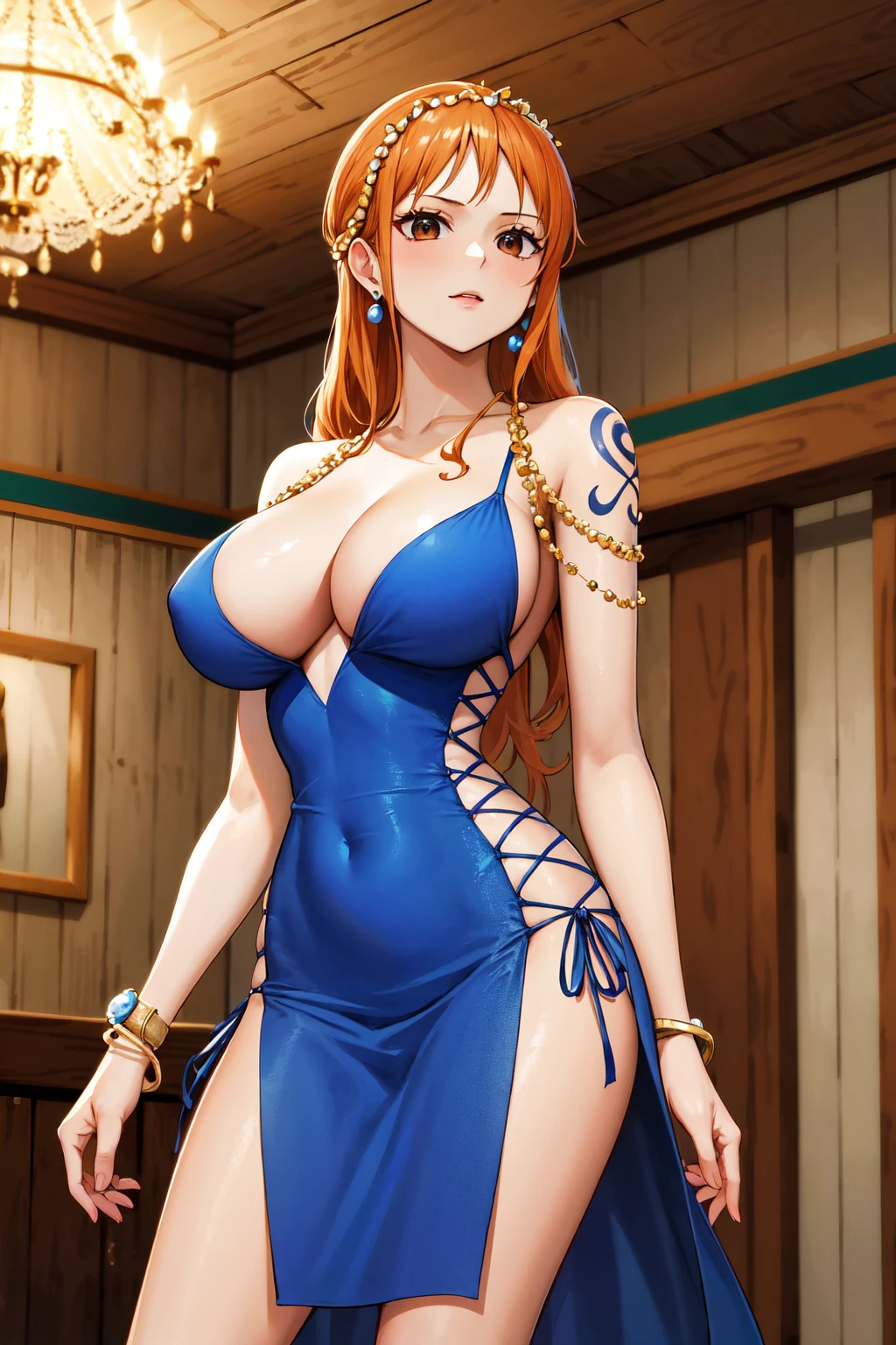 outfit2nami (one piece), long hair, orange hair, (hair ornament:1.1), brown eyes, (jewelry:1.1), earrings, bare shoulders, shoulder tattoo, cleavage, blue dress, sleeveless, bracelet, pelvic curtain, side slit