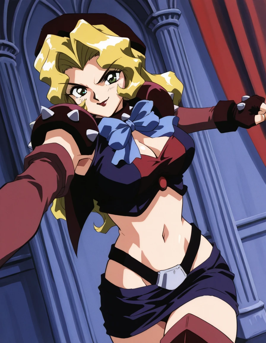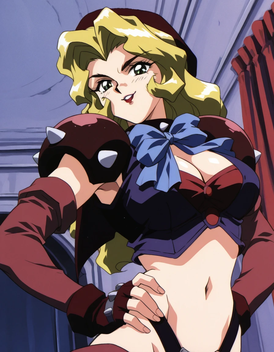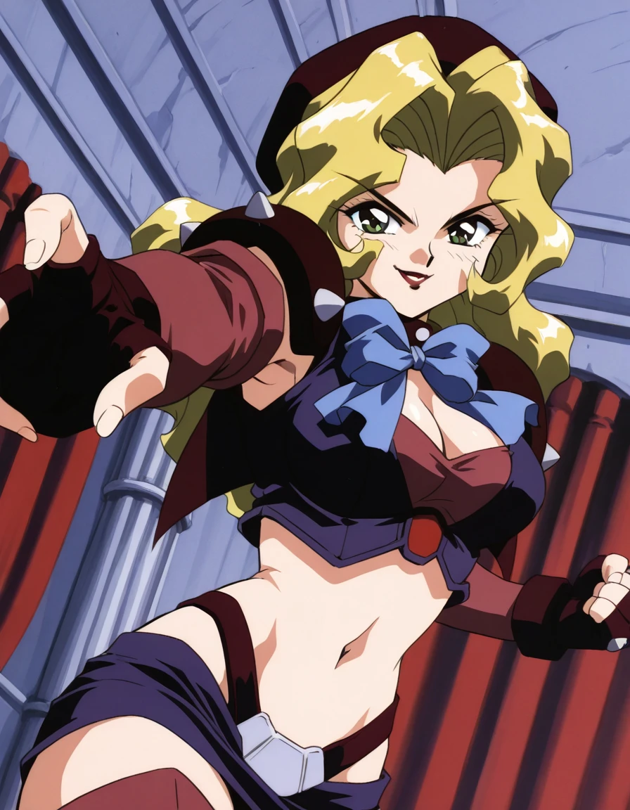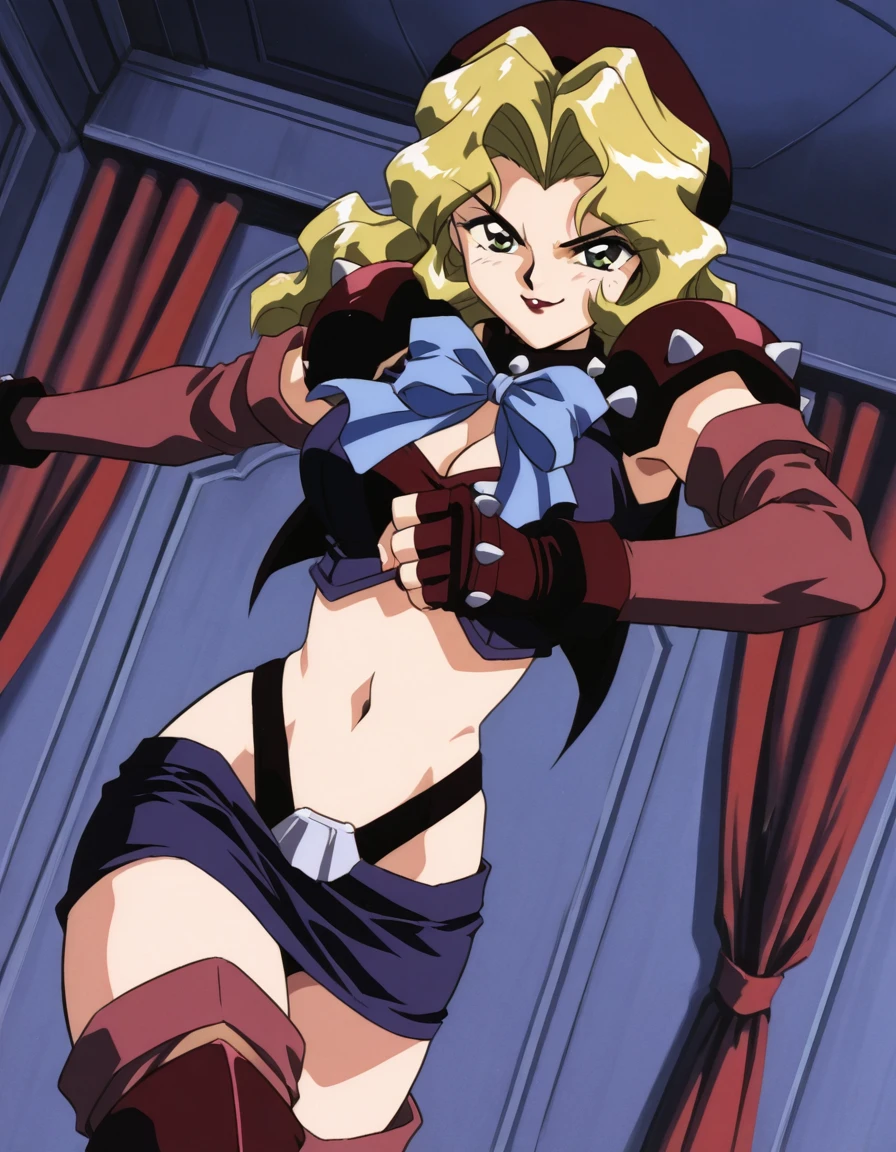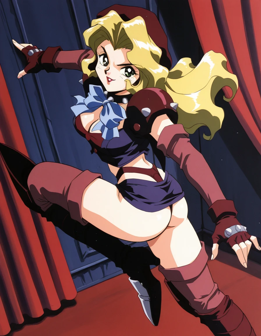 black spiked choker, red top, purple vest, maroon shoulder pauldron,maroon detached sleeves, dark maroon fingerless gloves, navel, red highleg thong, purple mini skirt,, maroon thighhighs, red armored greaves