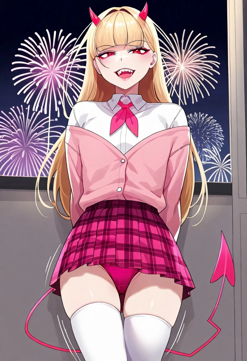 6. ((open off-shoulder long-sleeves pink cardigan, pink ribbon tie, long-sleeves collared white shirt, shirt tucked in, pleated plaid red miniskirt, pink panties, white thighhighs, )) devil girl cosplay, pink devil horns, pink devil tail, fangs, sharp teeth,