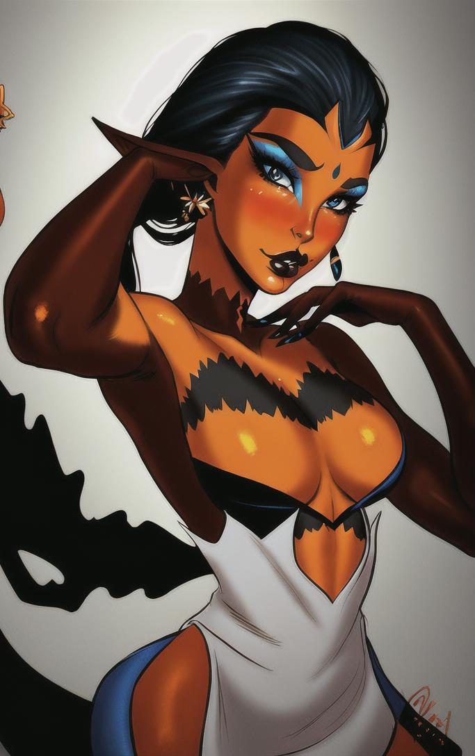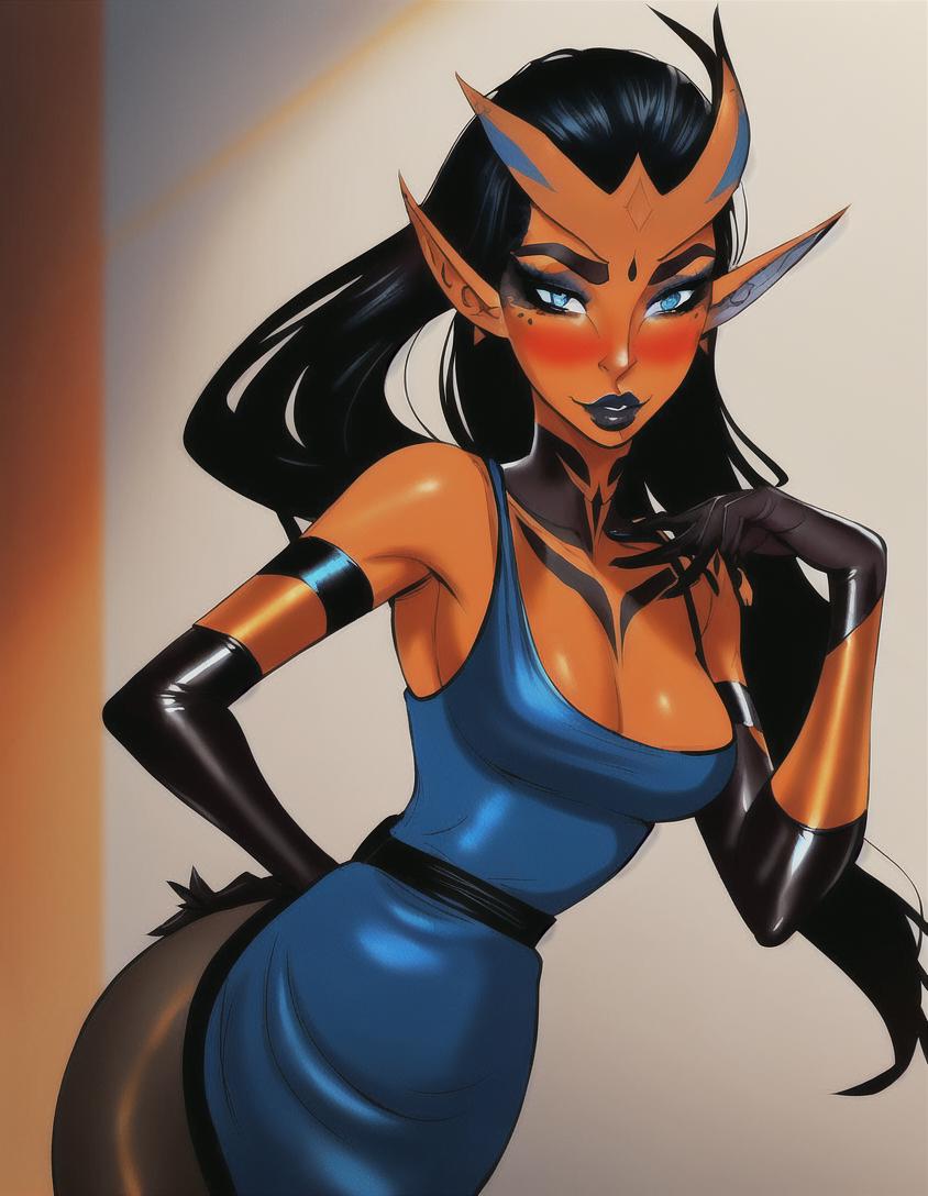You still need to be specific to accurately recreate the look of Puazi, so adding things like "heterochromia, blue and orange eyes, skin markings, pointy ears, horns, scarlet/orange skin, blue ??????" etc. to the prompt will help the model accurately match what the result should be.