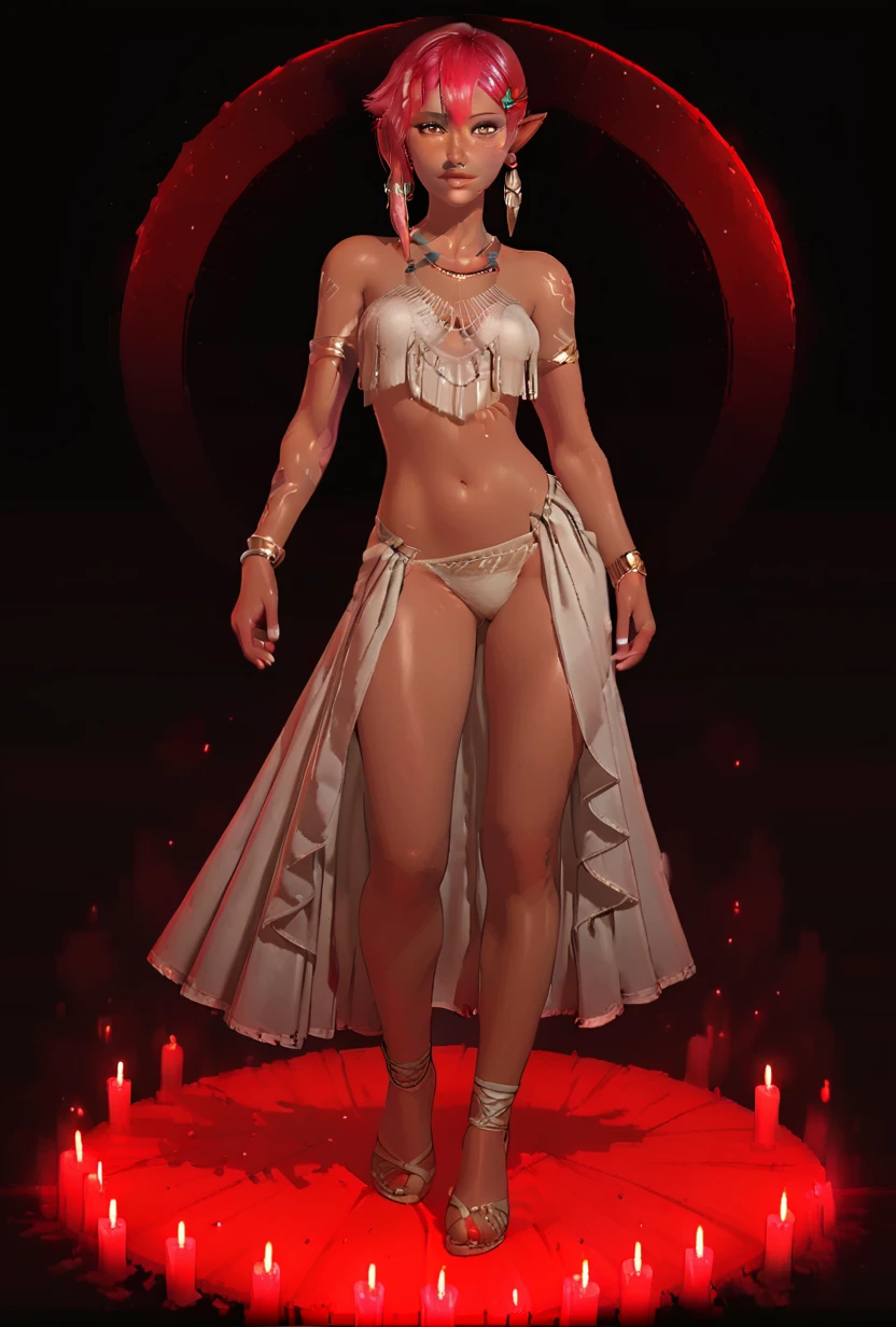 s3ra_3ros, 1girl, short hair, dark-skinned female, pointy ears, dark skin, tattoo, red hair, pink hair, lips, brown eyes, hair ornament,