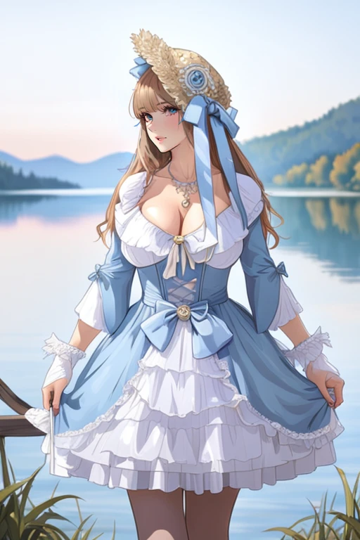 whdbd,blue dress,jewelry,necklace,bonnet,long sleeves,bow,lace trim,lace,frills,pantyhose