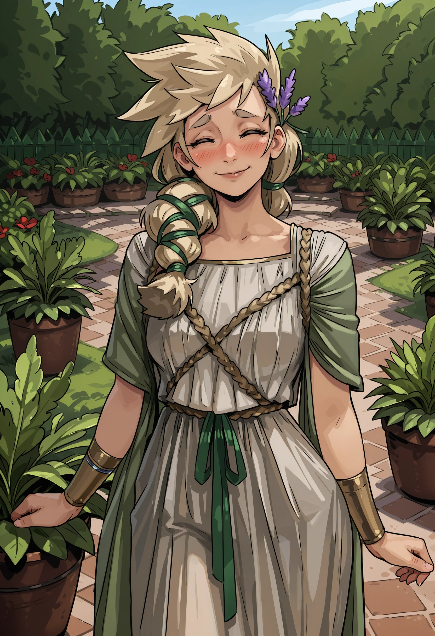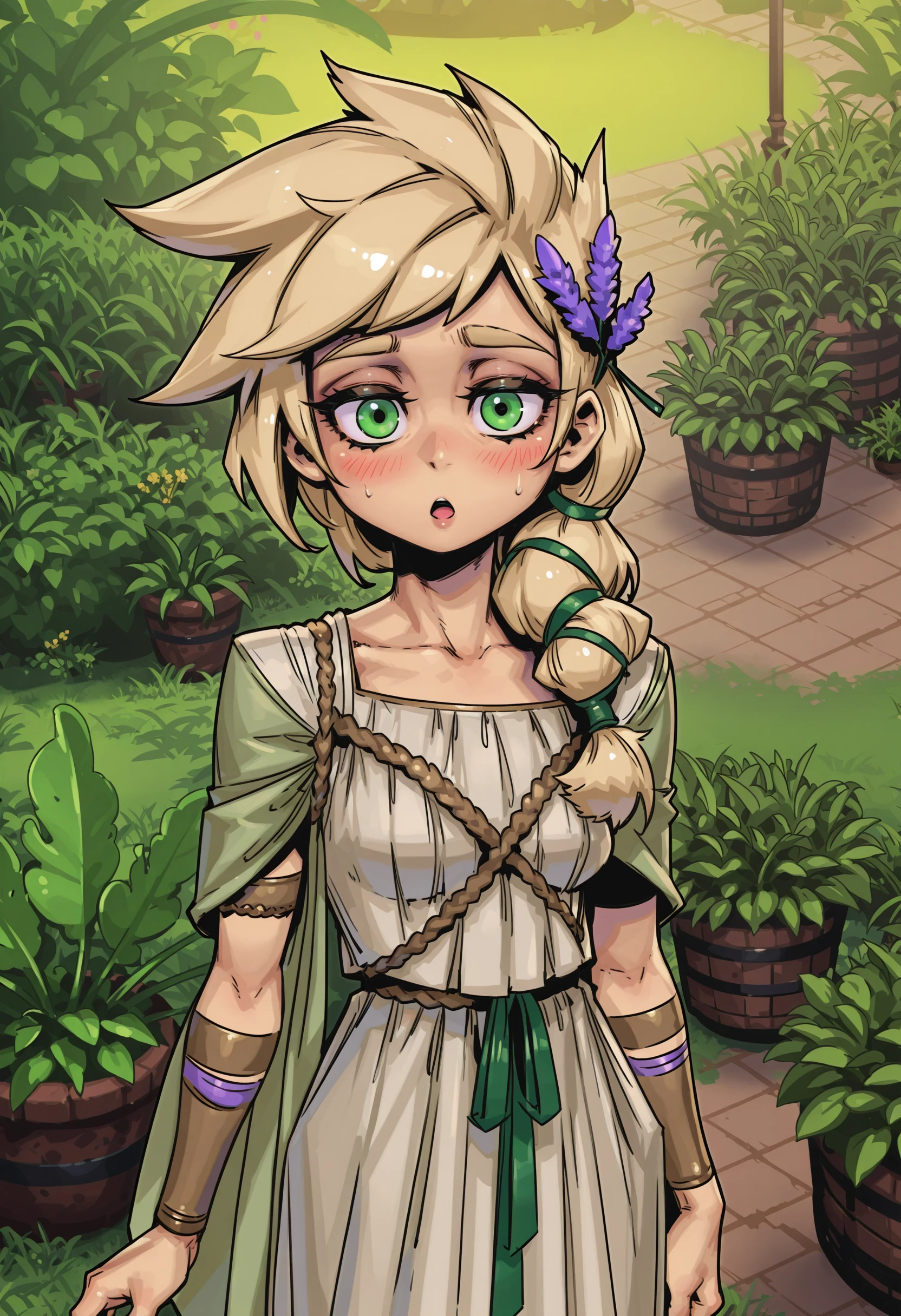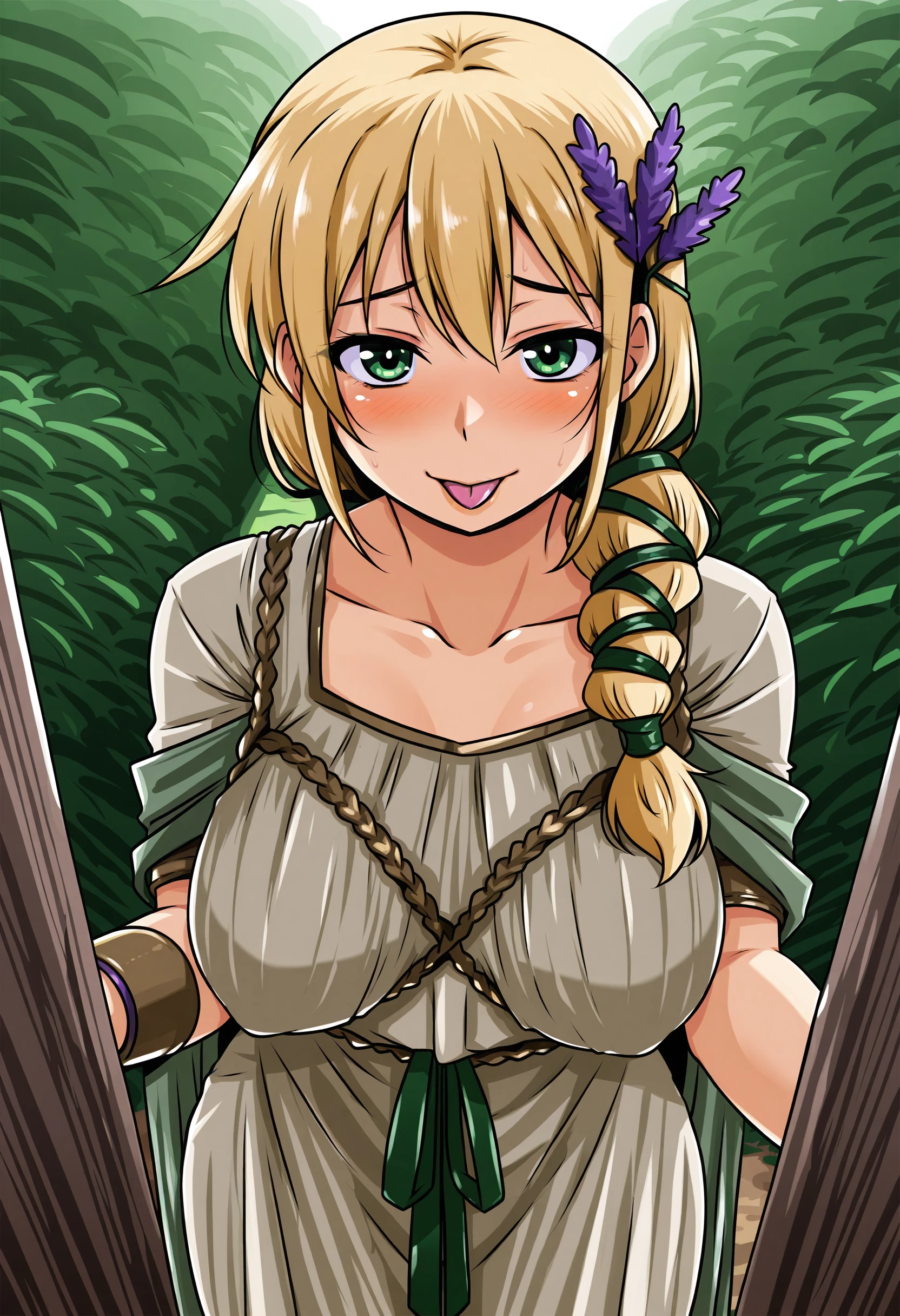 persilf, blonde hair, braid, green eyes, dress, hair ornament,