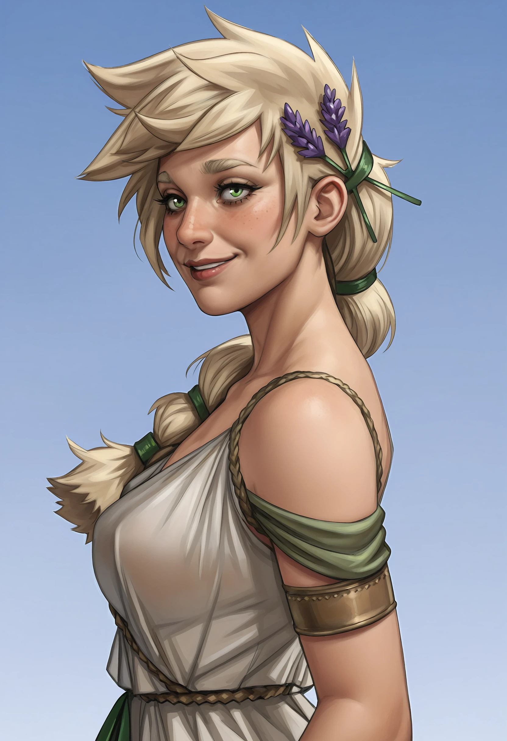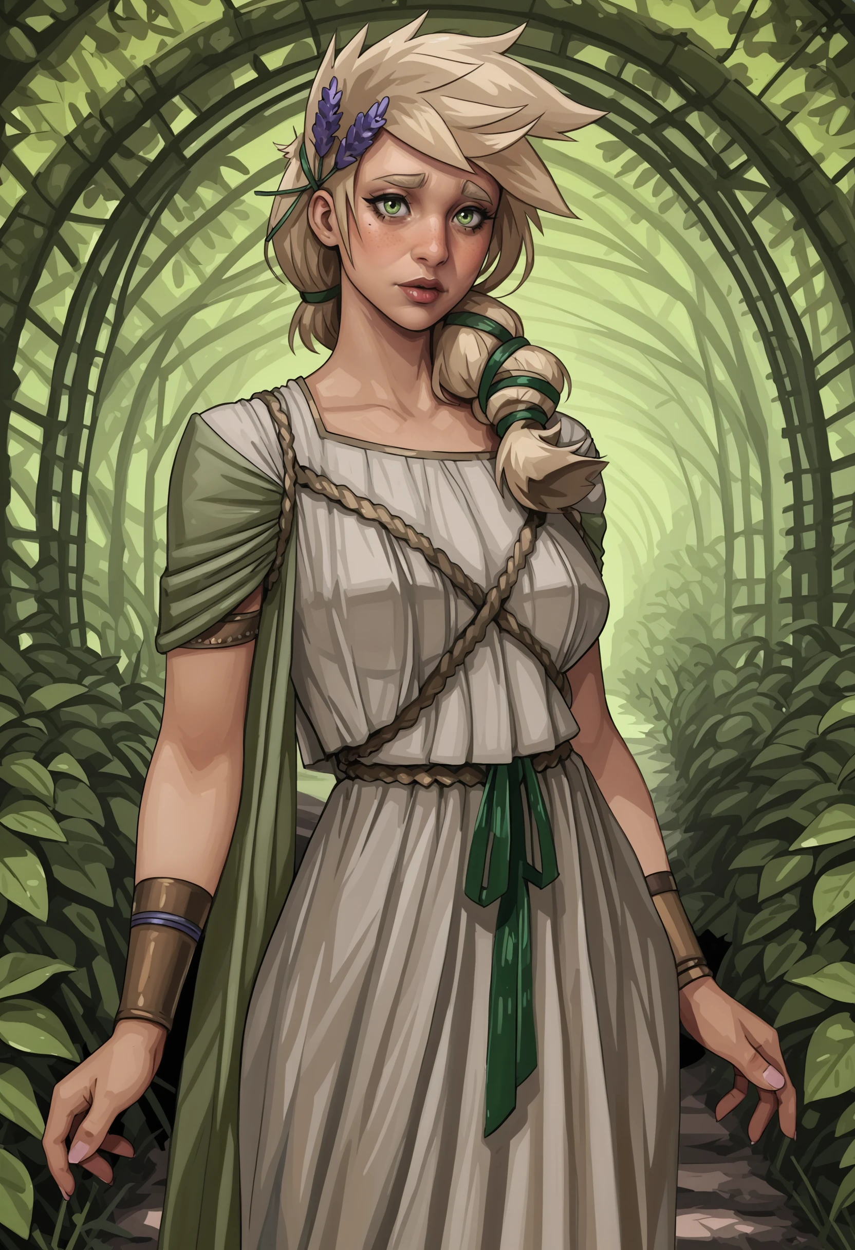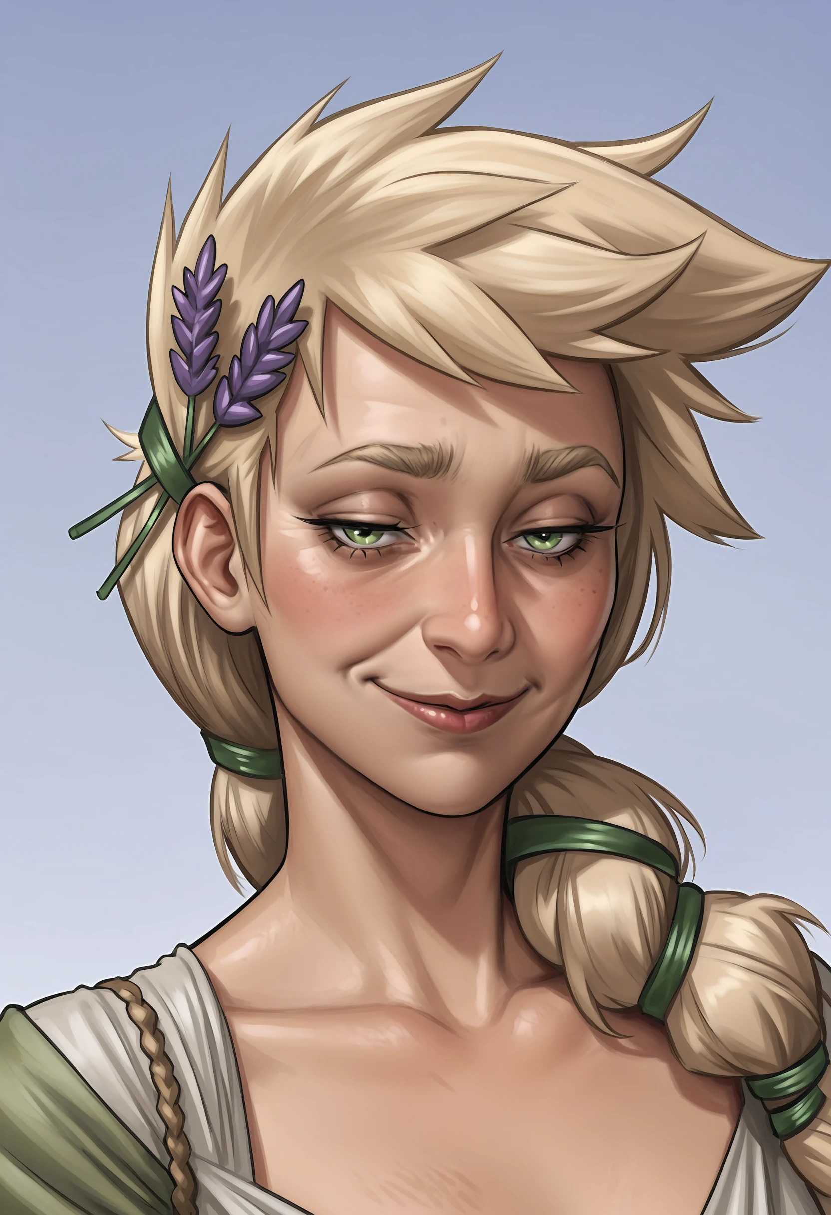 persilf, blonde hair, braid, green eyes, dress, hair ornament,