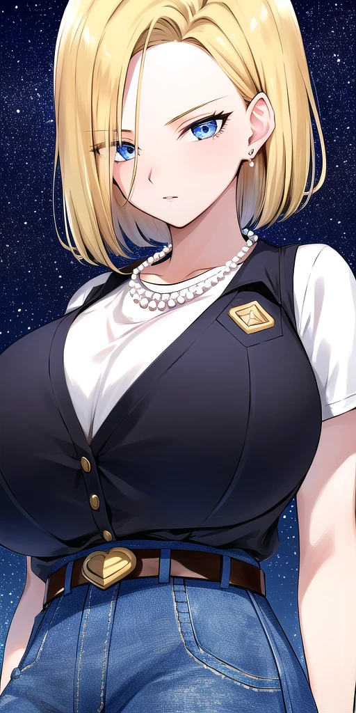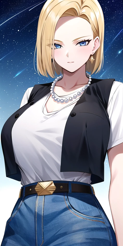 Black_vest_White_shirt_short_sleeves_Jeans_high-waist_pants_Belt_Pearl_necklace: Her black vest, white blouse and jeans attire.