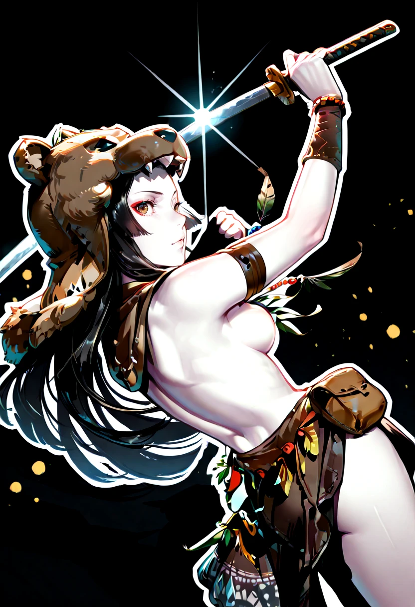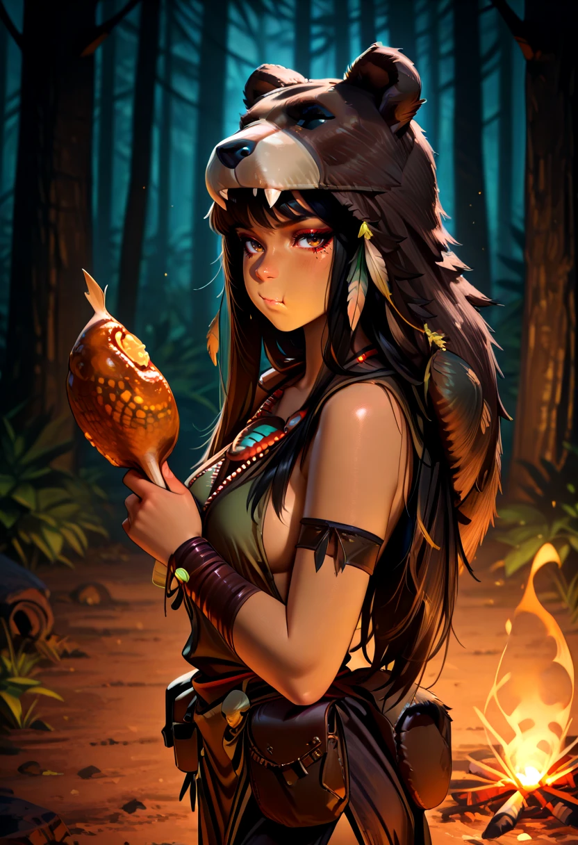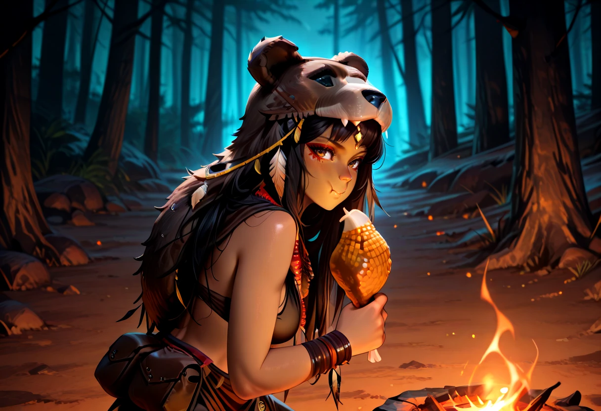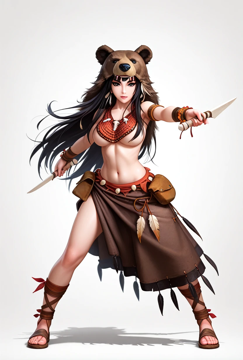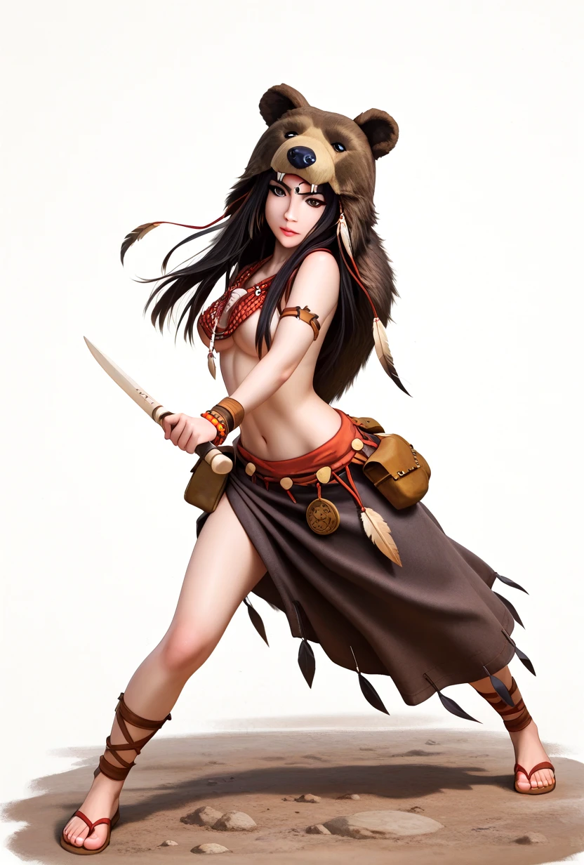 shamh5, brown eyes, long hair, black hair, straight hair, brown skin, eyeliner, medium breasts,sideboobs, bear hood, animal pelt hood, tribal jewelry, beaded necklace, feather ornament, leather bracelet, tribal armlet, leather pouch, loincloth, fur clothing, tribal clothing, leather straps,