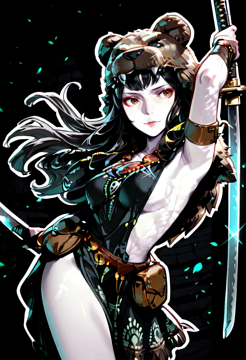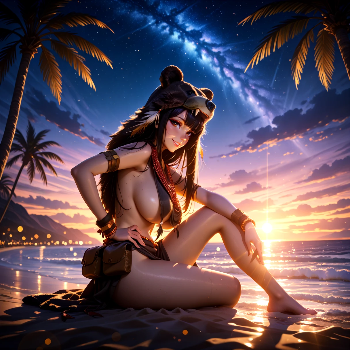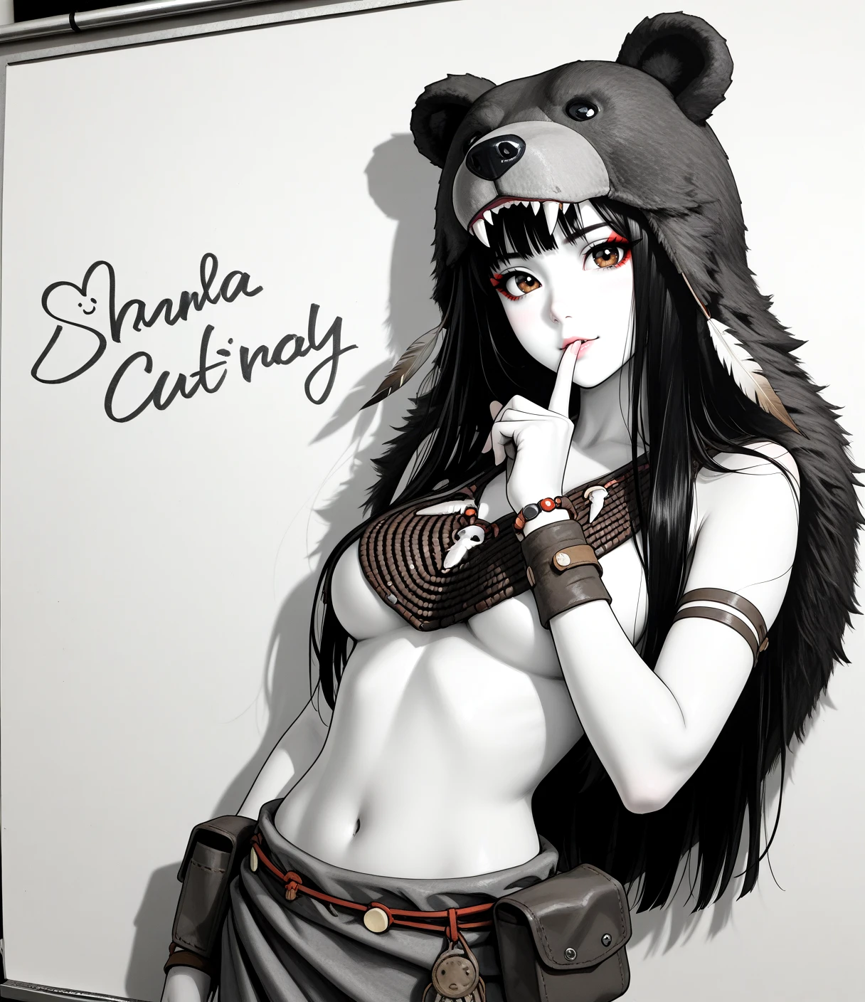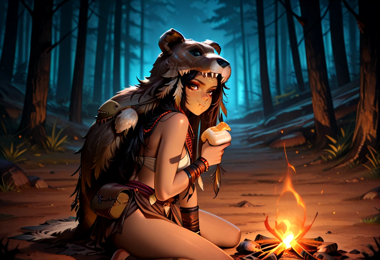 shamh5, brown eyes, long hair, black hair, straight hair, brown skin, eyeliner, medium breasts,sideboobs, bear hood, animal pelt hood, tribal jewelry, beaded necklace, feather ornament, leather bracelet, tribal armlet, leather pouch, loincloth, fur clothing, tribal clothing, leather straps,